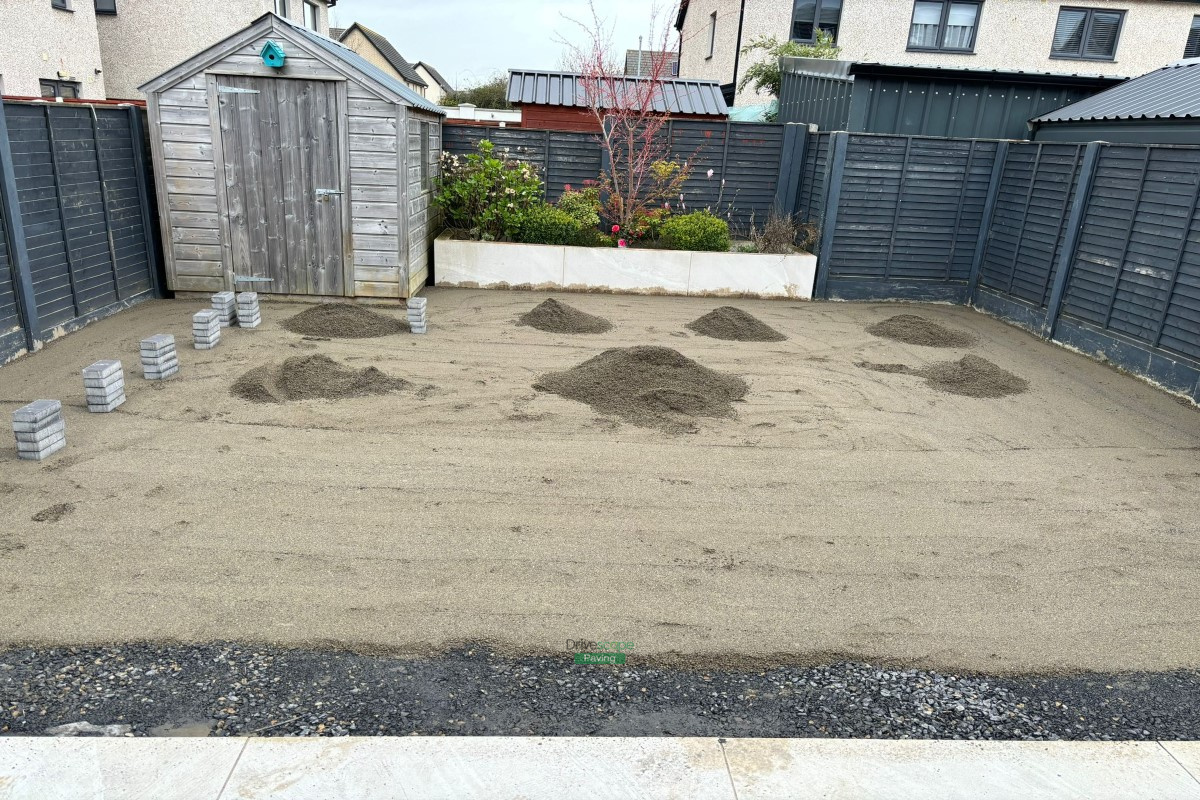 BEFORE & AFTER – 40 mm artificial grass installation with 200 by 100 mm paving brick border and drain channels in Hansfield Wood, Dublin.