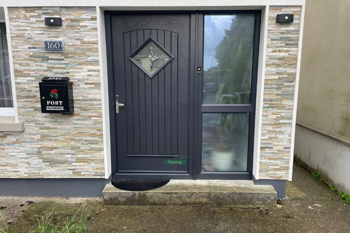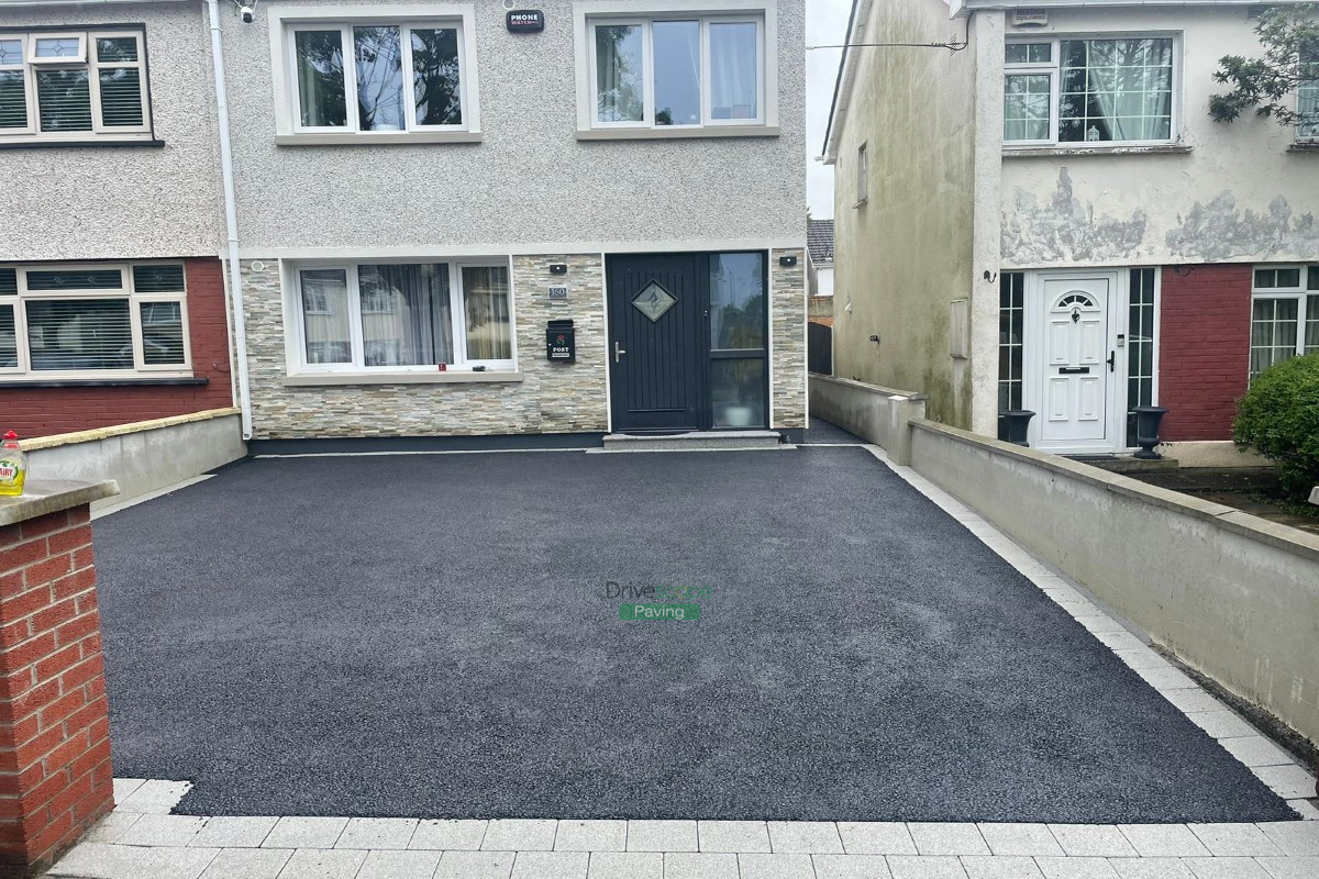 Drivescape Paving installed a new driveway in Blanchardstown, Dublin, featuring an asphalt surface with silver granite Corrib brick border and a granite doorstep.