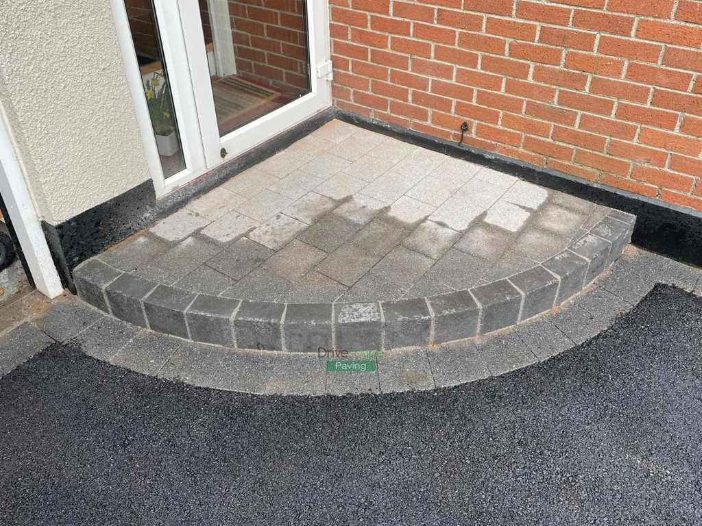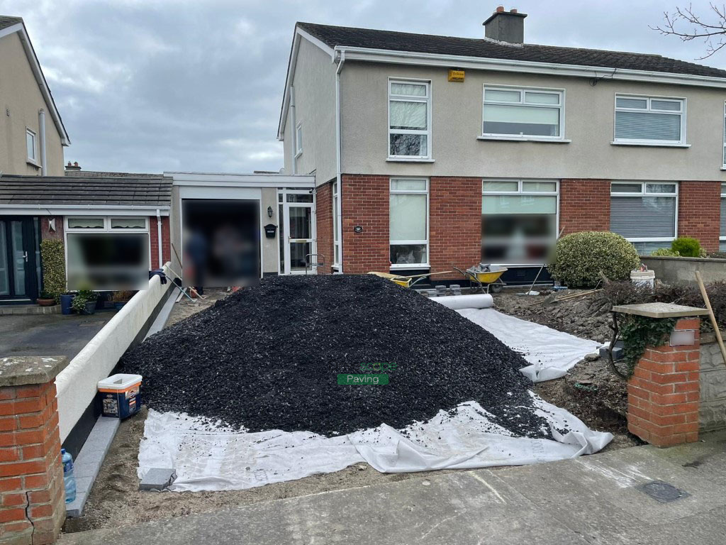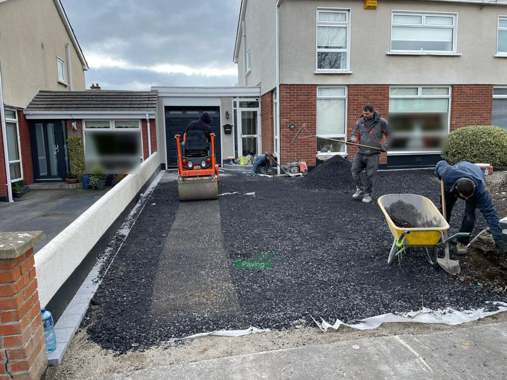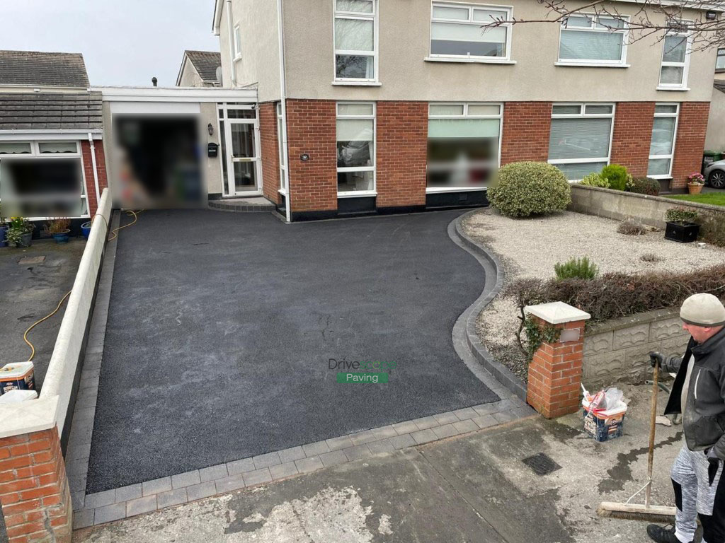 We installed a new driveway in Portmarnock, Co. Dublin using asphalt top finish with black granite Corrib border and kerbing, a doorstep to match and gravel flowerbeds on the side. We also repaired one of the existing pillars and topped both with new copping.