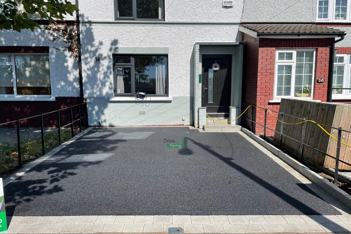 New asphalt driveway installed in Killester, Dublin, using stone mastic asphalt, silver granite Corrib paving as borderlines, granite kerbstone and granite slabs for steps. The project also features a new post at the entrance.