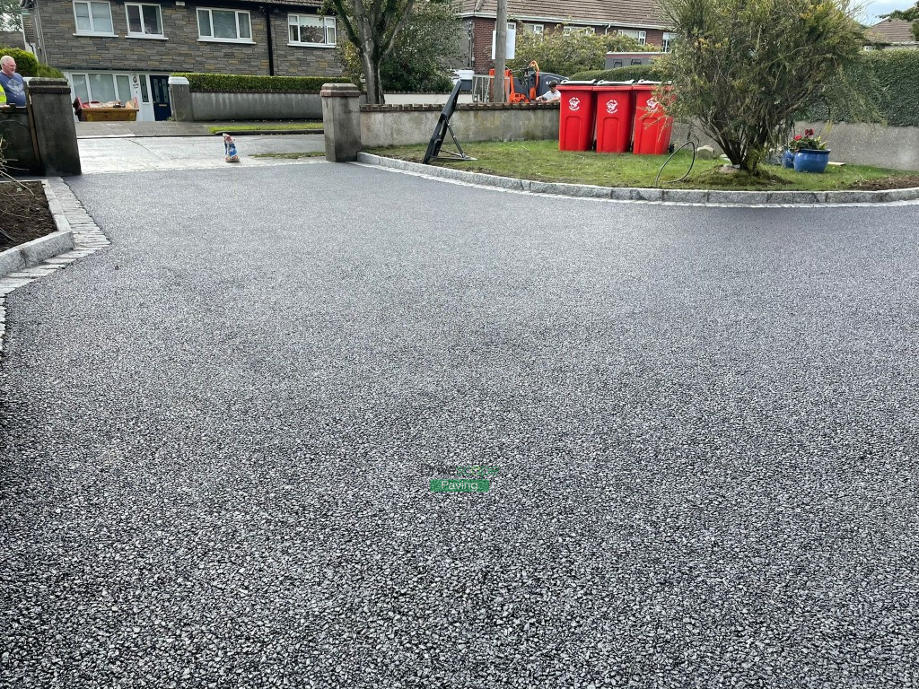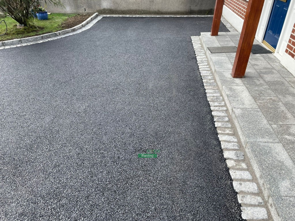 Our team at Drivescape Paving has recently installed this asphalt driveway in Raheny Dublin. The driveway features asphalt top finish with silver granite cobble setts, granite slabs for the doorstep and new kerbing. We also removed the front pillar and wall to widen the entrance for a better access.