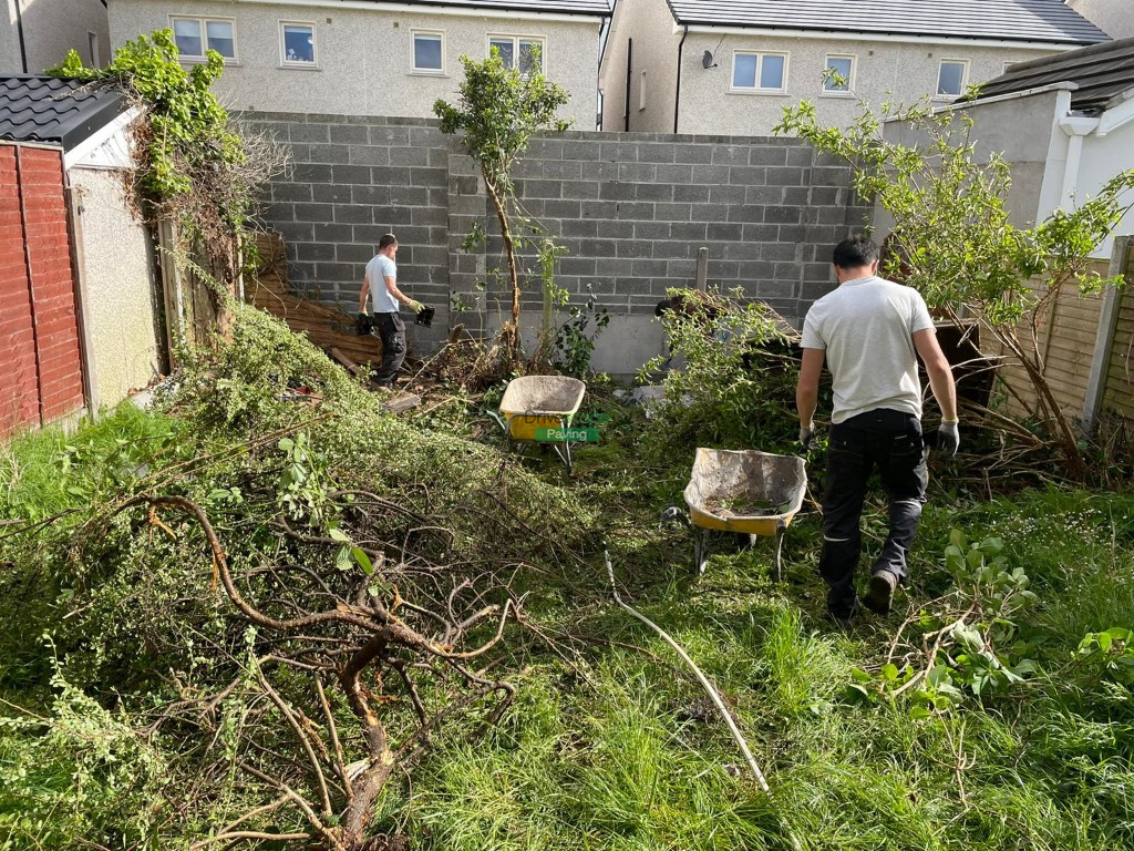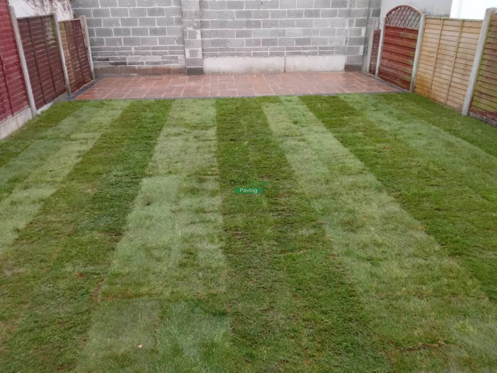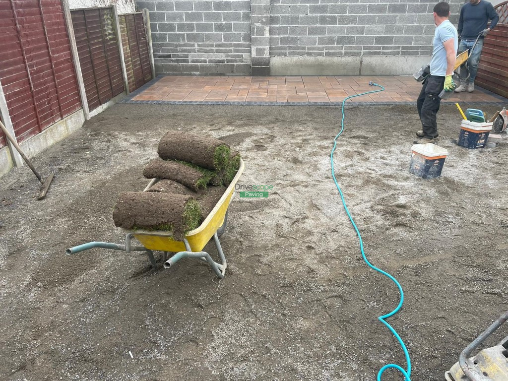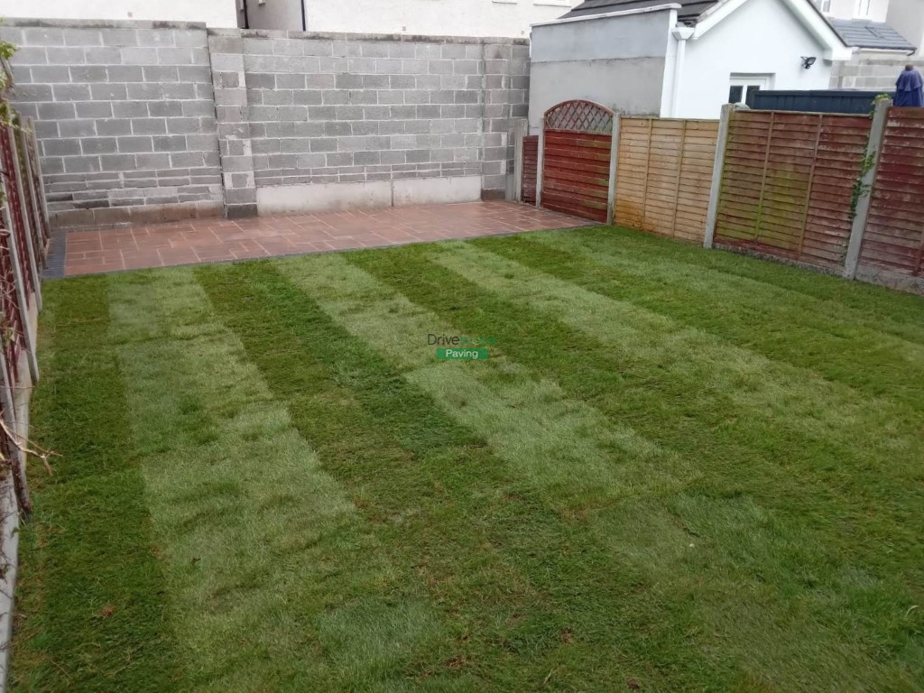 A new patio has been completed by Drivescape Paving in Donabate, Co. Dublin, featuring Curragh gold Belvedere granite slabs with a charcoal borderline and joined grout. We also applied a new roll-on turf lawn.