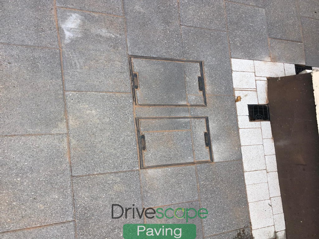 For the patio, we used 600 by 300 Black Granite slabs with Lizmore Silver Granite border. The layout includes two recessed manhole covers.