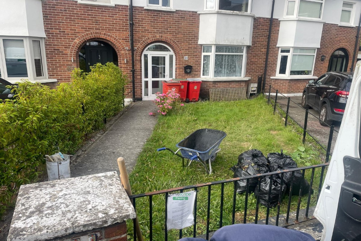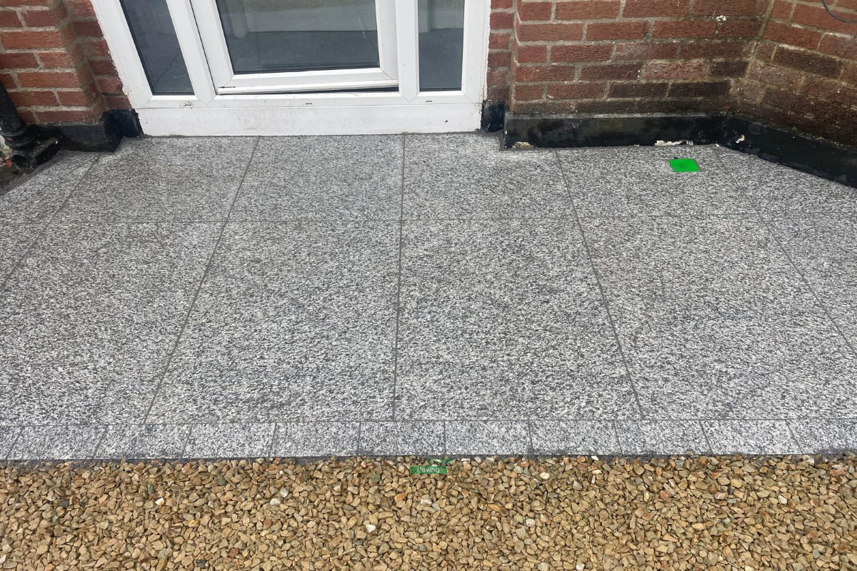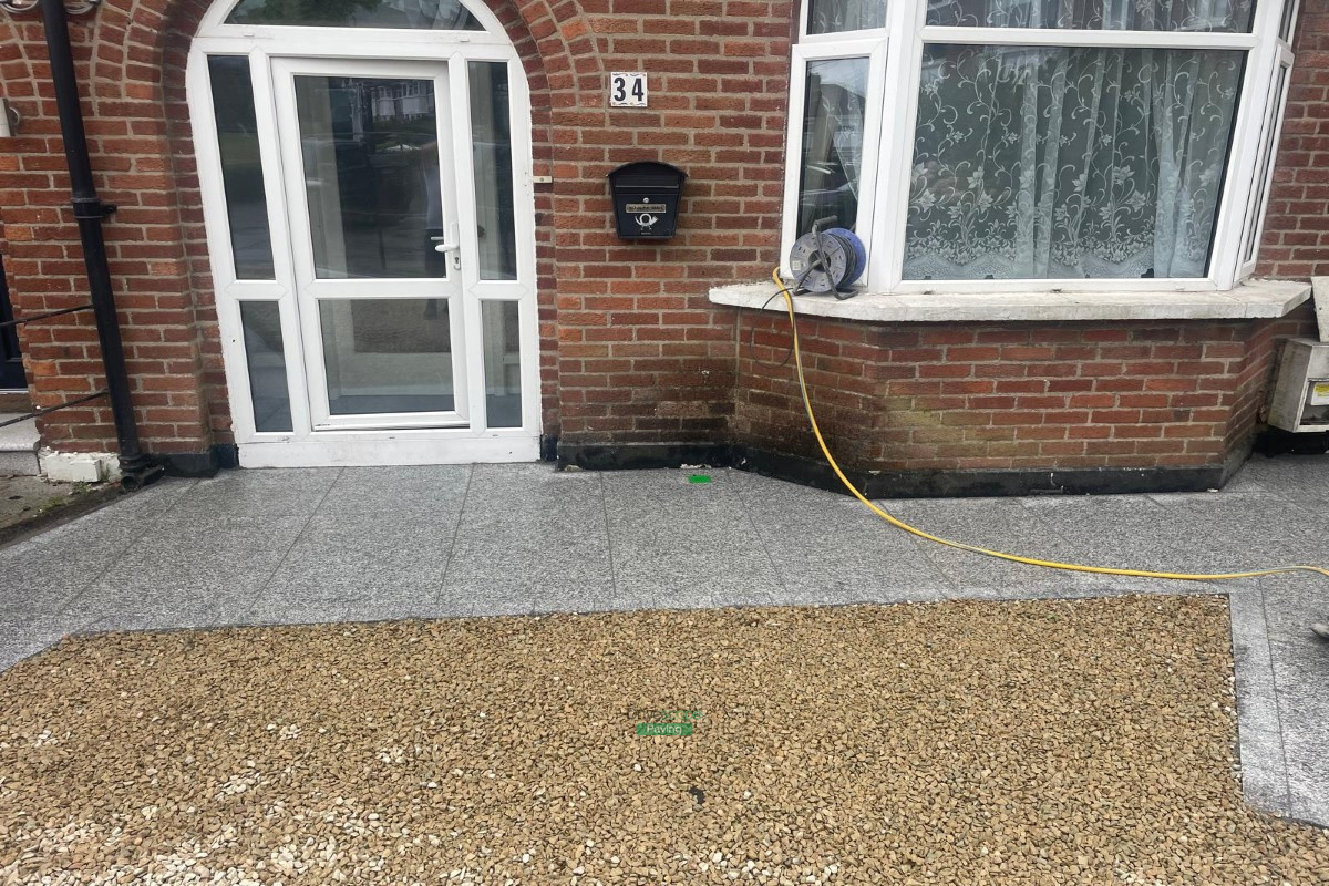 This driveway project features 600 x 900 mm silver granite slabs, 200 x 100 mm matching cobblestones and ‘golden’ Ballylusk gravel.