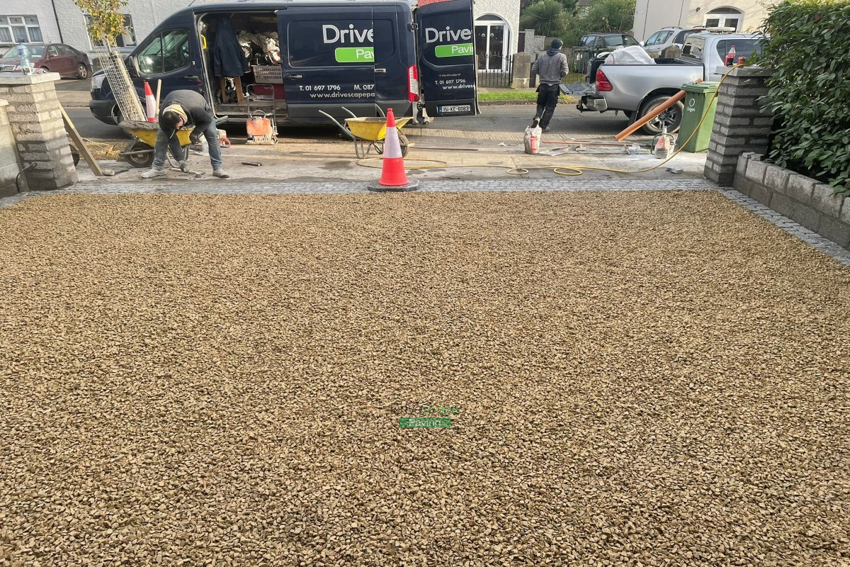 Driveway with Ballylusk Gravel, Granite Cobbles and New Pillars in Ashtown, Dublin
