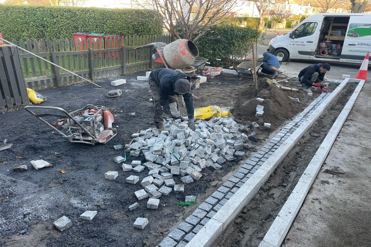 This beautiful new driveway features golden Ballylusk gravel with 100 by 100 mm silver granite cobblestones for borders and apron. We also built new raised flowerbeds with natural granite kerbstones and new privacy screen.