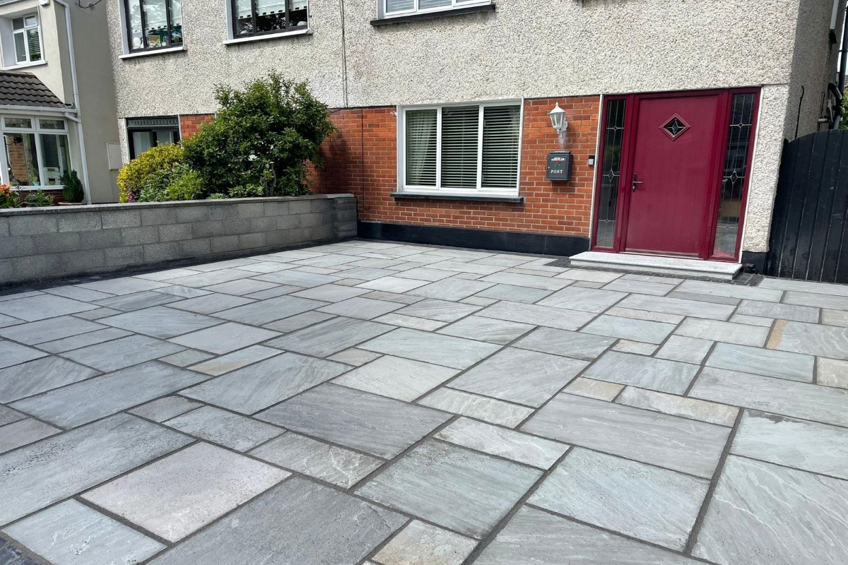 Drivescape Paving completed a new project in Hartstown, Dublin. For this driveway, our team used Kandla grey limestone slabs in various sizes with black limestone cobbled border. We also fitted a new bullnose granite step.