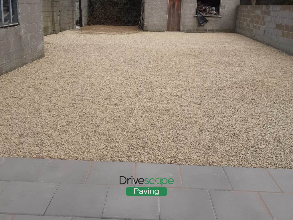 We laid the patio with 400 by 400 Natural paving slabs and filled the remaining area with Ballylusk Golden gravel.