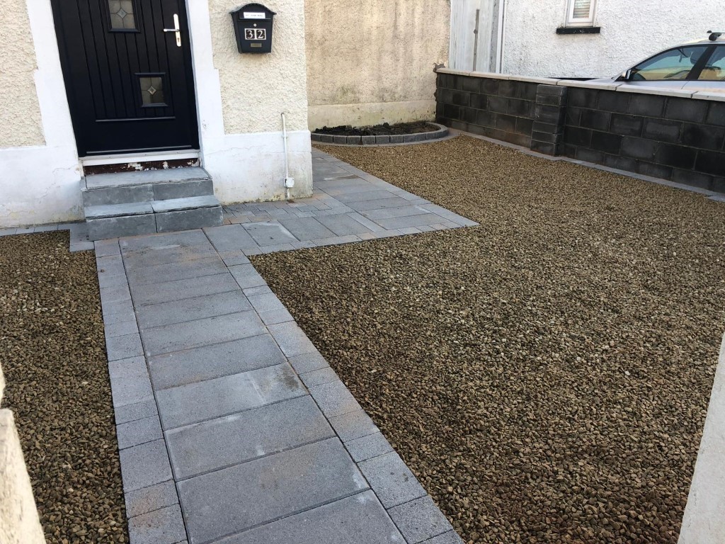 The pathway to and around the house was laid with Lismore Black Granite Slabs and Lismore Paving Bricks. We also installed two raised flower beds in two opposing corners for a spot of greenery. Finally our team poured Ballylusk Gravel in Gold colour all over the remaining area.