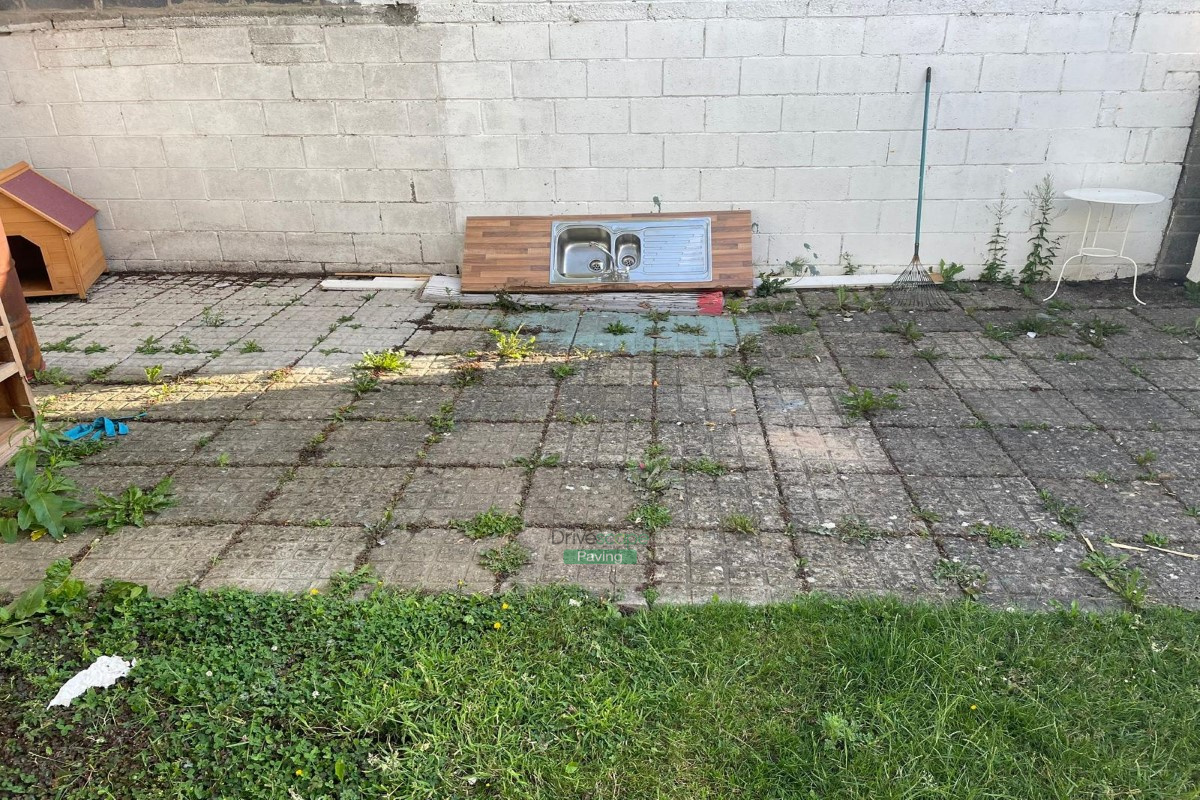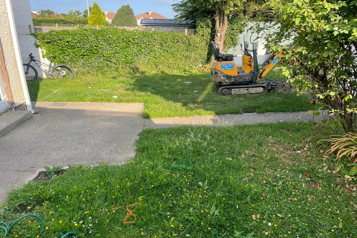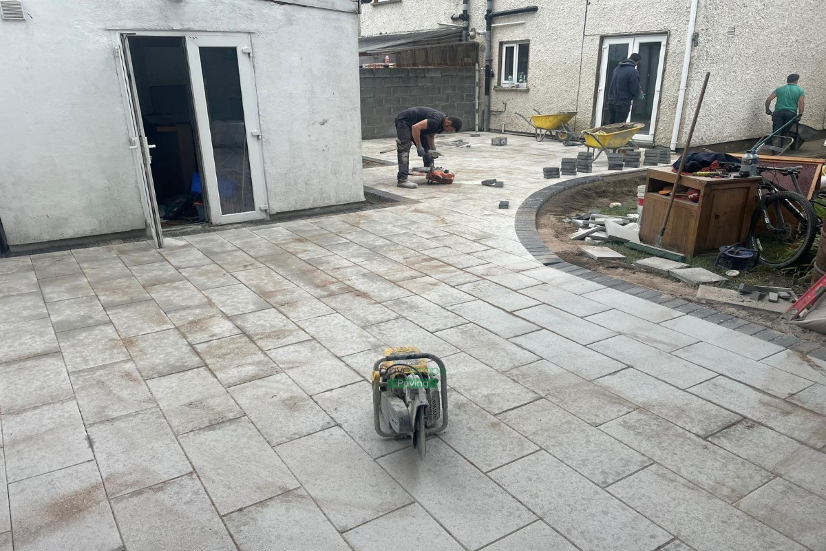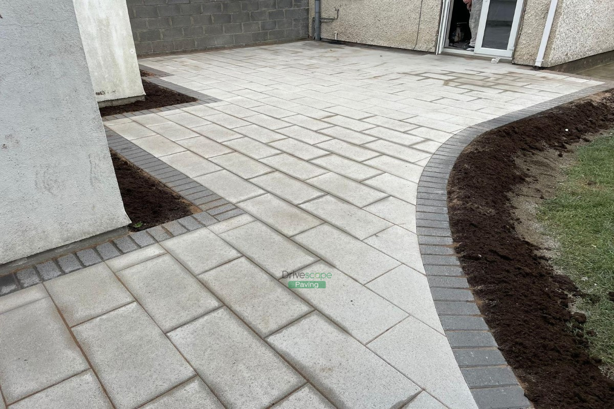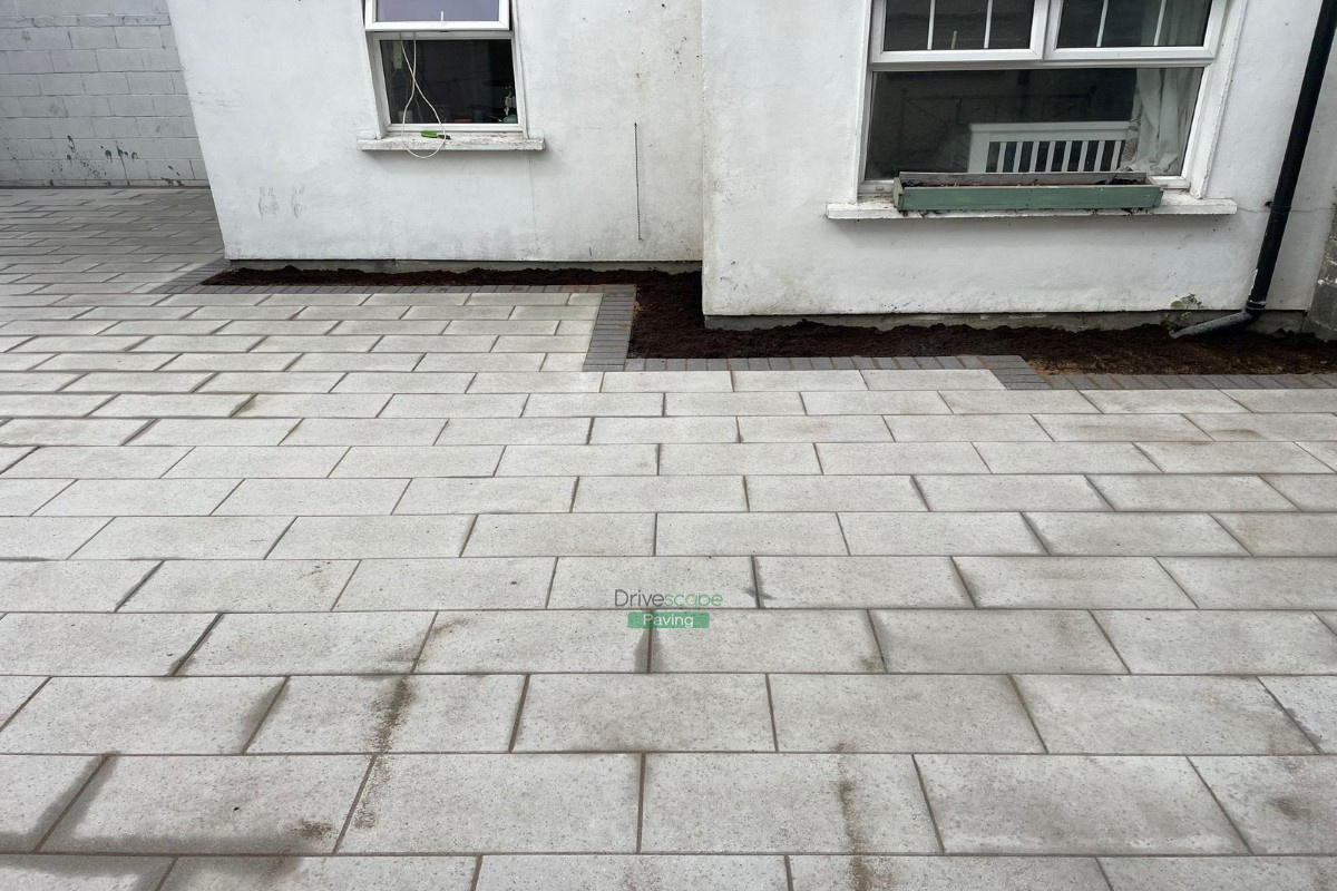 Drivescape Paving completed a new patio in Lucan, Dublin, using 600 by 400 mm ‘silver’ Newgrange granite slabs, charcoal borders, recessed manhole cover and ACO drains. Notice the lovely curved design of the flowerbeds.