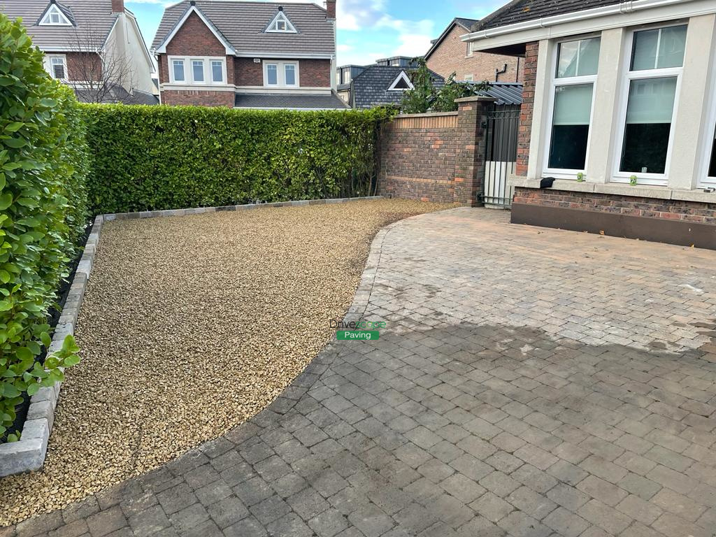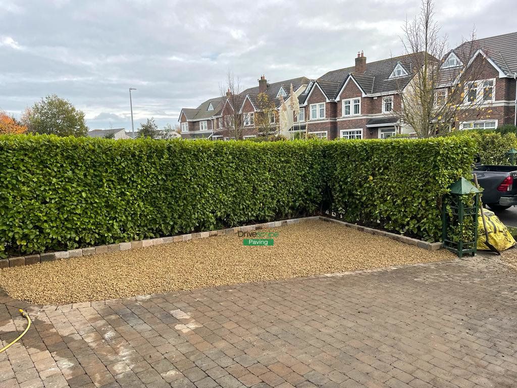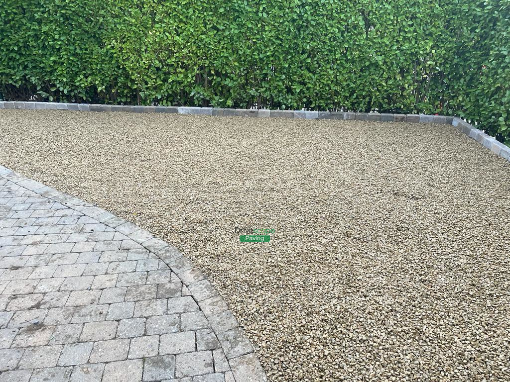 New driveway extension has been completed by Drivescape Paving in Donabate, Co. Fingal, with 14 mm Ballylusk golden gravel and original kerbstones.