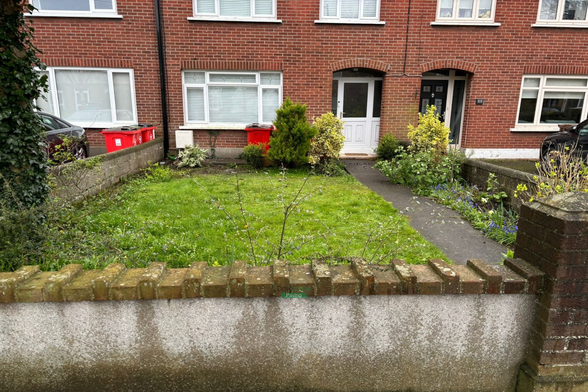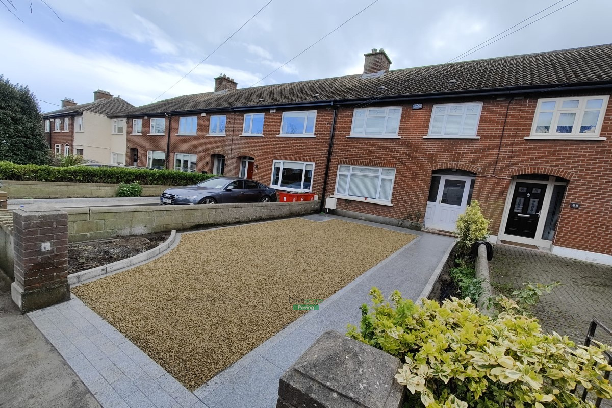This driveway in Clontarf, Dublin, features 14 mm Ballylusk gravel, 600 by 900 mm silver granite slabs for the pathway, and 200 by 100 mm granite cobbles for the border.