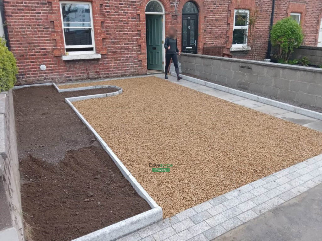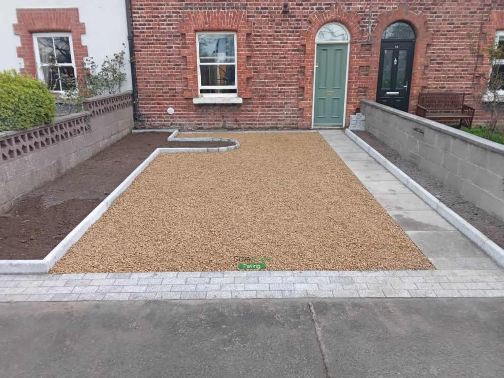 What a transformation this project was! We dug out the original surface and installed a hardcore foundation with a weed control membrane. We created a new pathway on the right-hand side with 600 by 600 mm silver granite slabs and an apron out of 200 by 100 mm cobbles. We built raised flower beds with bull-nose edging kerbs on either side and applied fresh topsoil. Finally, we laid the driveway itself with golden Ballylusk gravel.