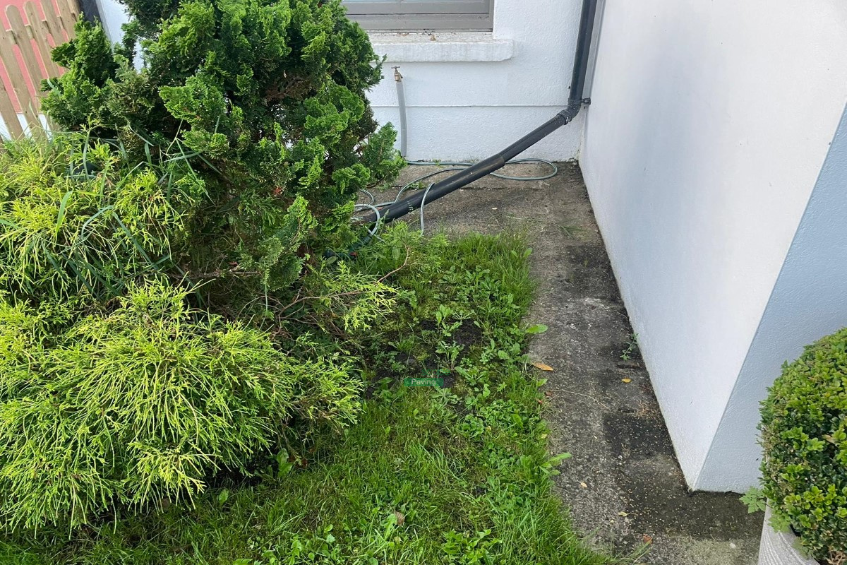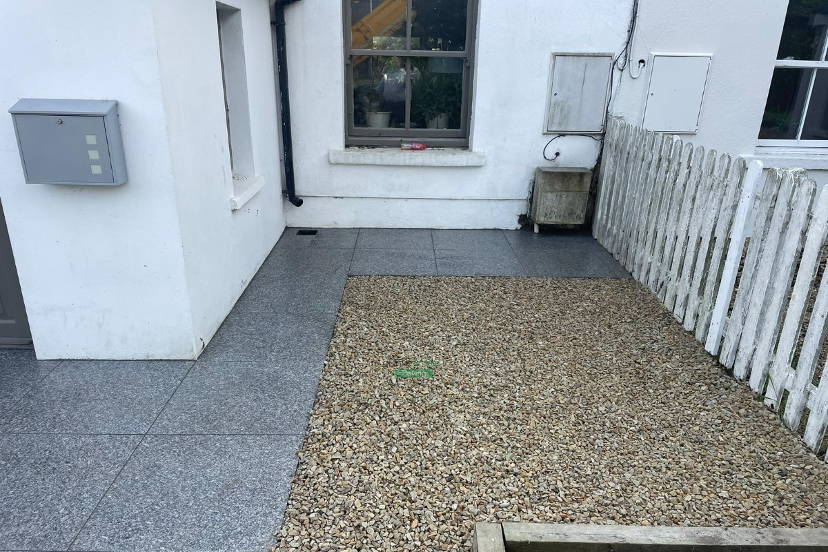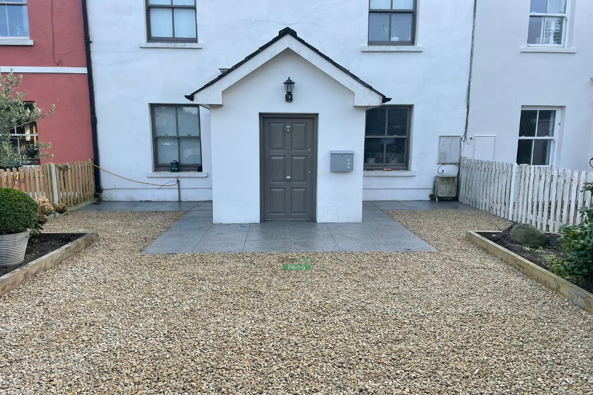 This driveway transformation features Donegal quartz gravel, granite cobbles for the apron and 600 by 600 mm granite slabs around the entrance.