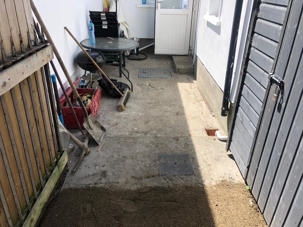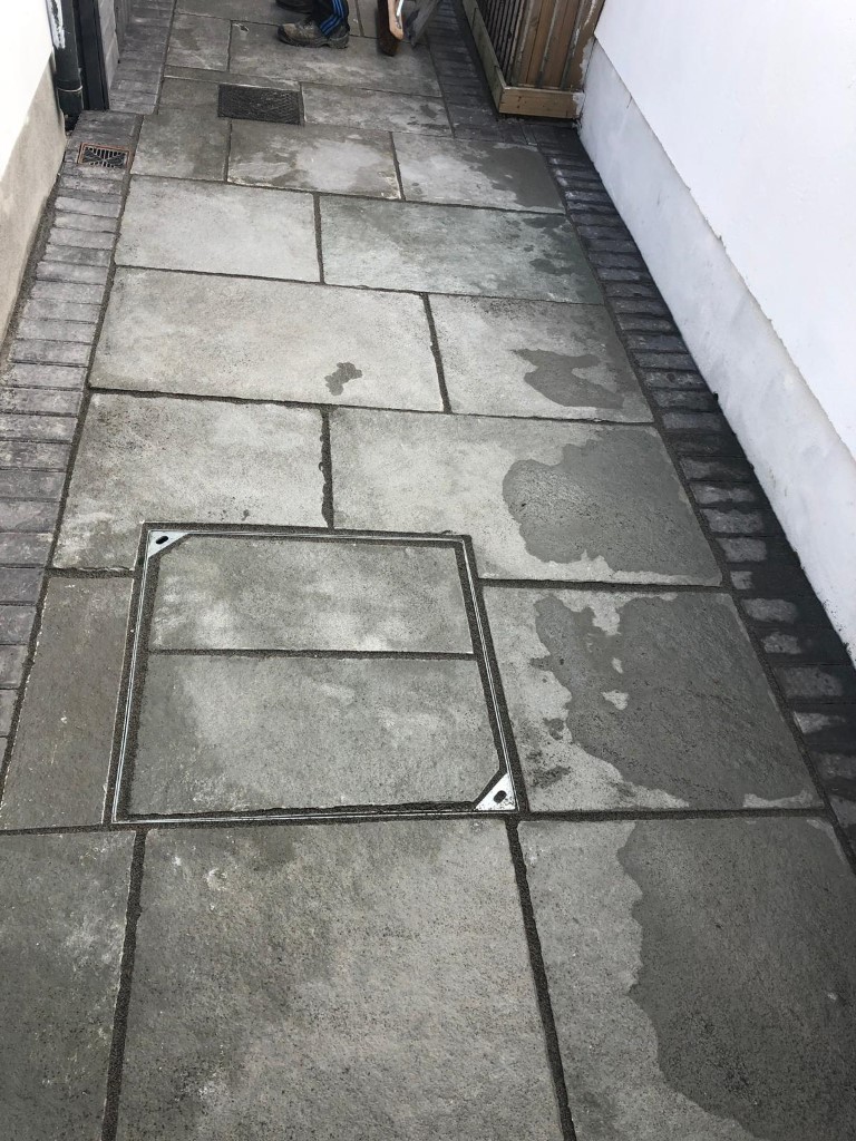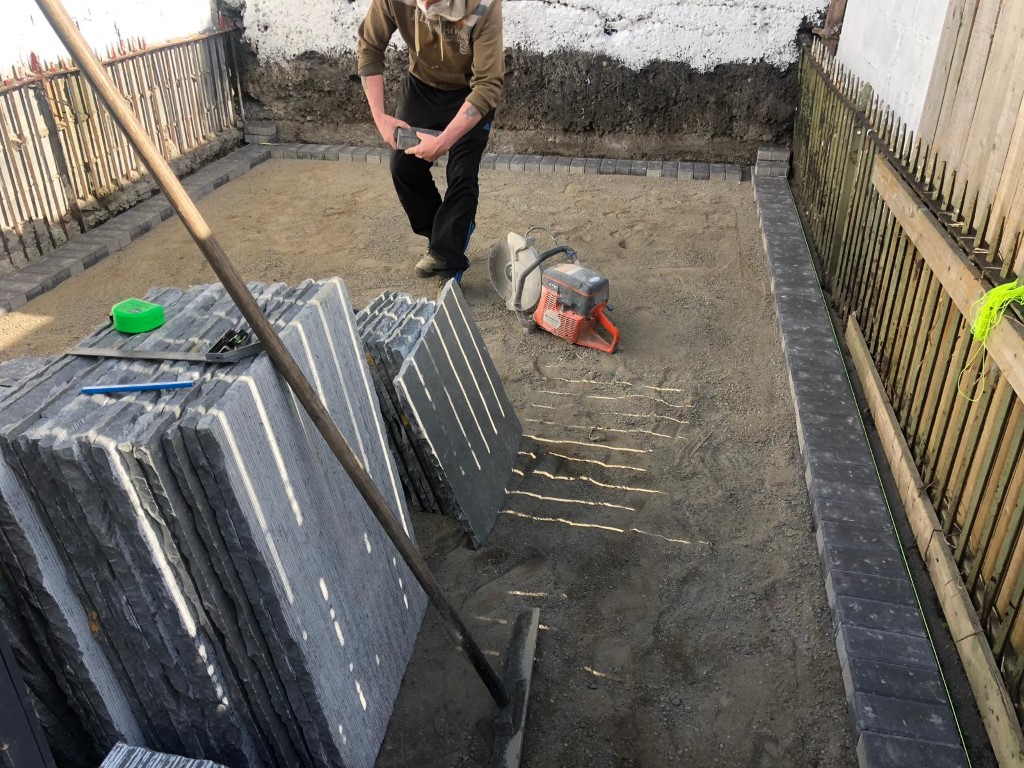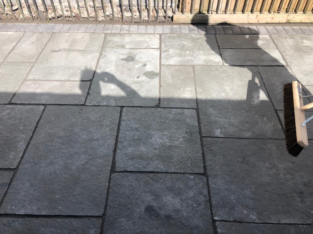 Finally we laid the patio with Grey Limestone Slabs in various sizes and grouted the spacing in between.