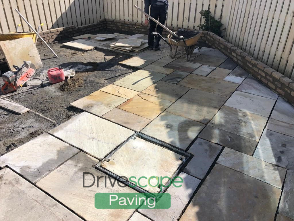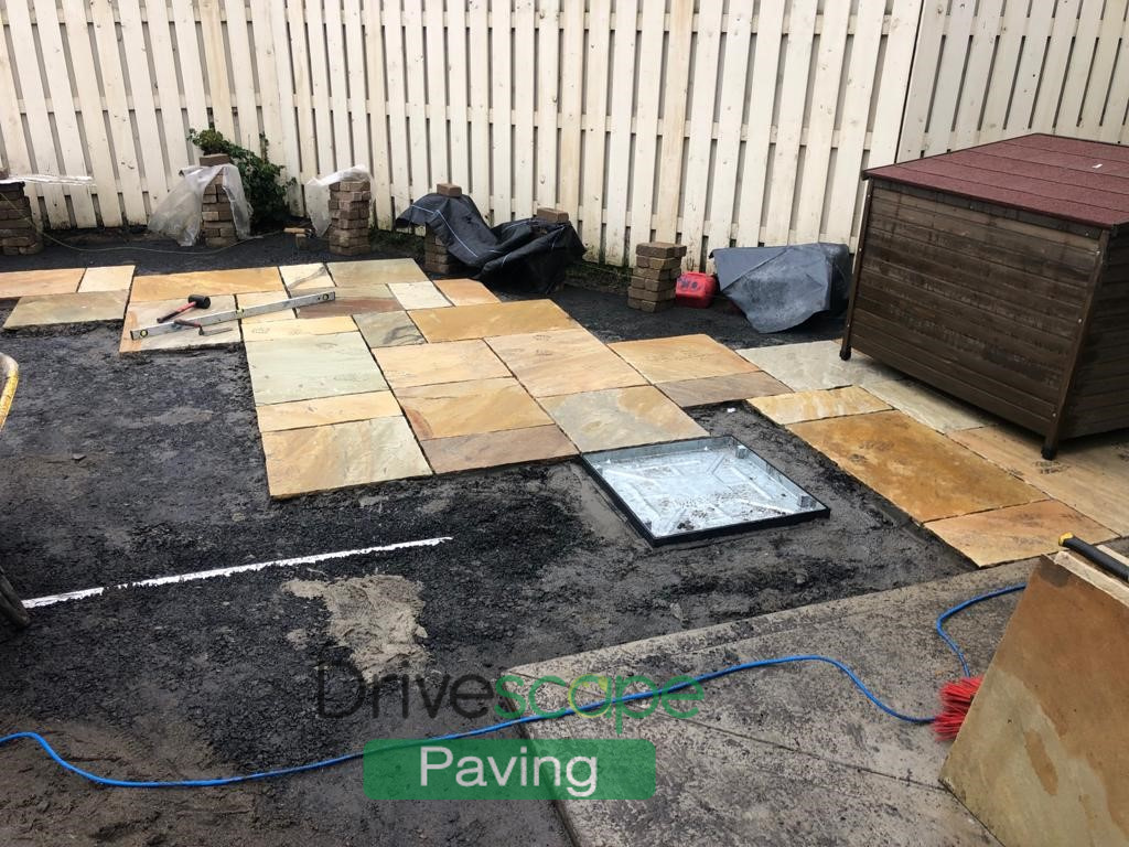 We laid the patio using Indian Sandstone slabs in various sizes.