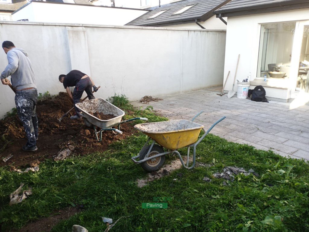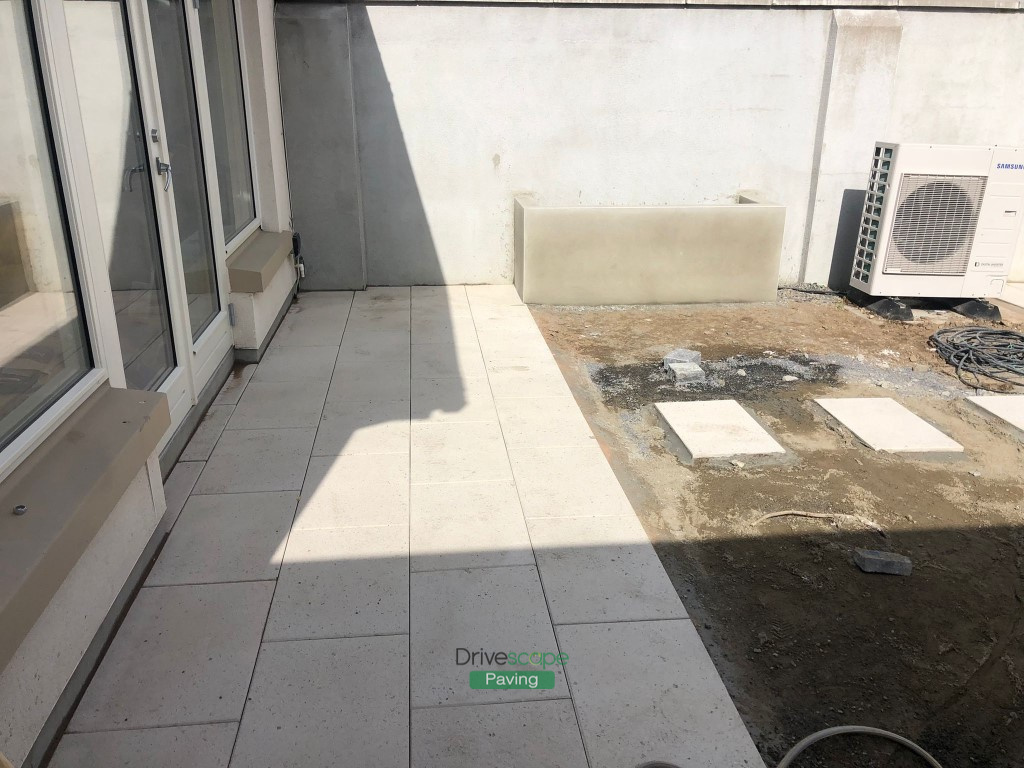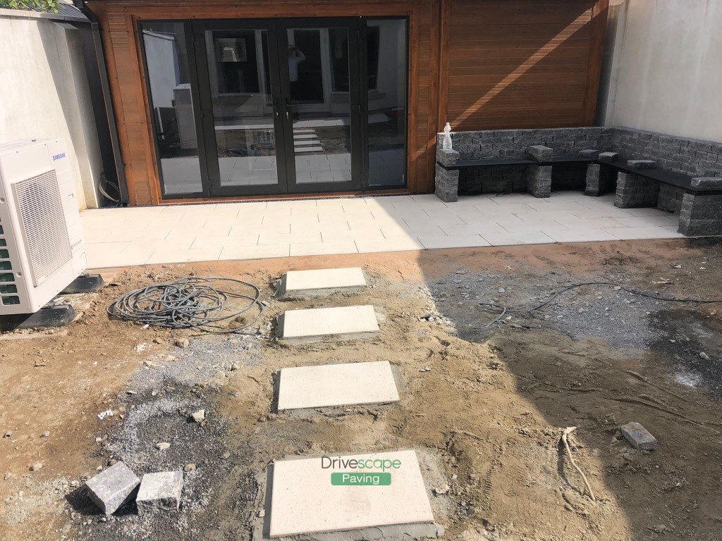 New patio has been installed by Drivescape Paving in Carrickmines, Dublin. We used 600 by 400 mm Kilsaran Oyster slabs and we also installed new stepping stones and raised flower beds. Customers will be finishing the job themselves by installing gravel and shrubs in the remaining areas.
