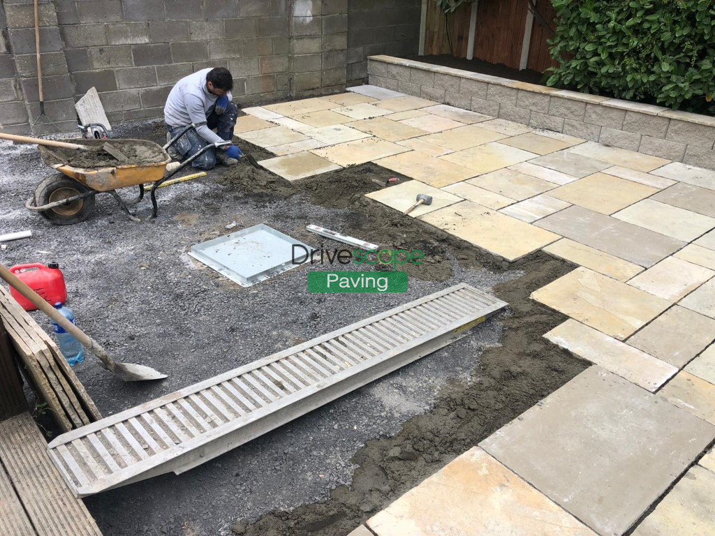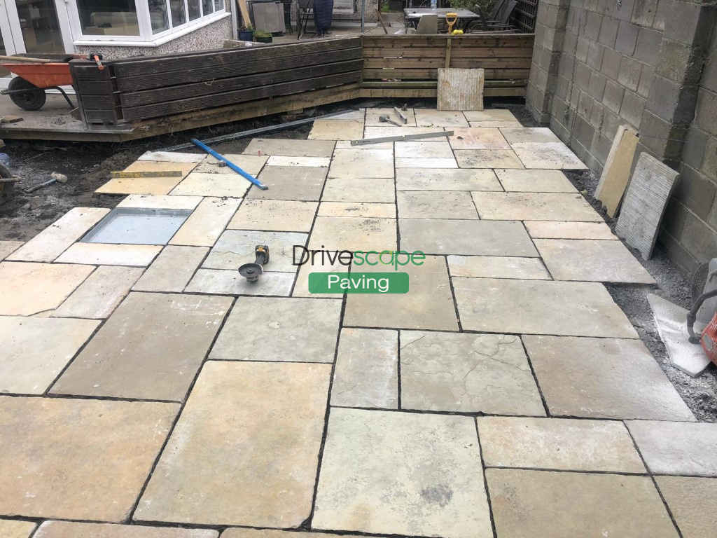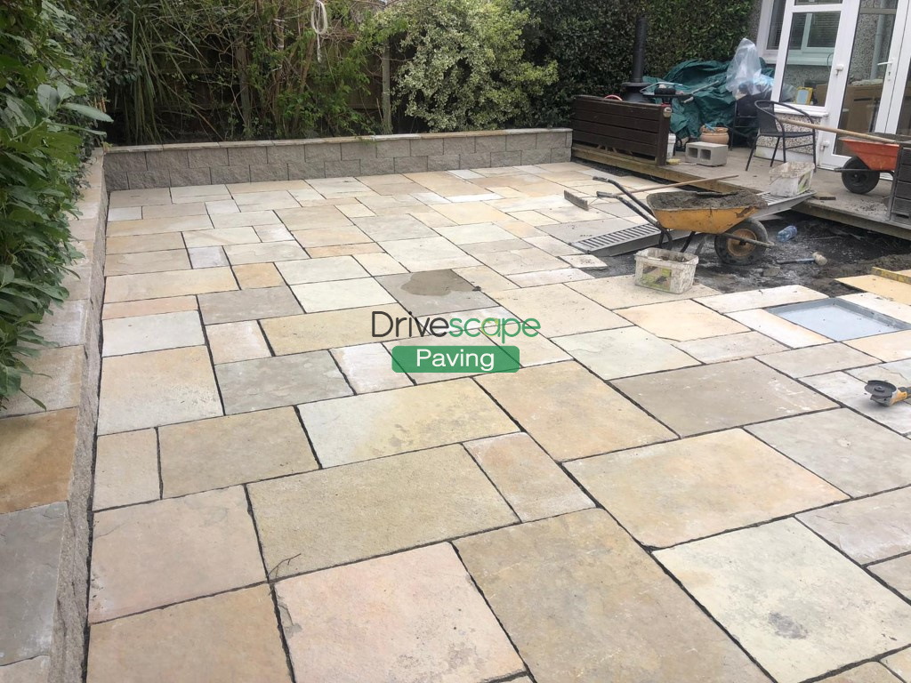 Our team at Drivescape Paving has installed this patio in Ashford, using Yellow Limestone slabs. The project also features raised flower beds, new ACO drain channels and recessed manhole cover.