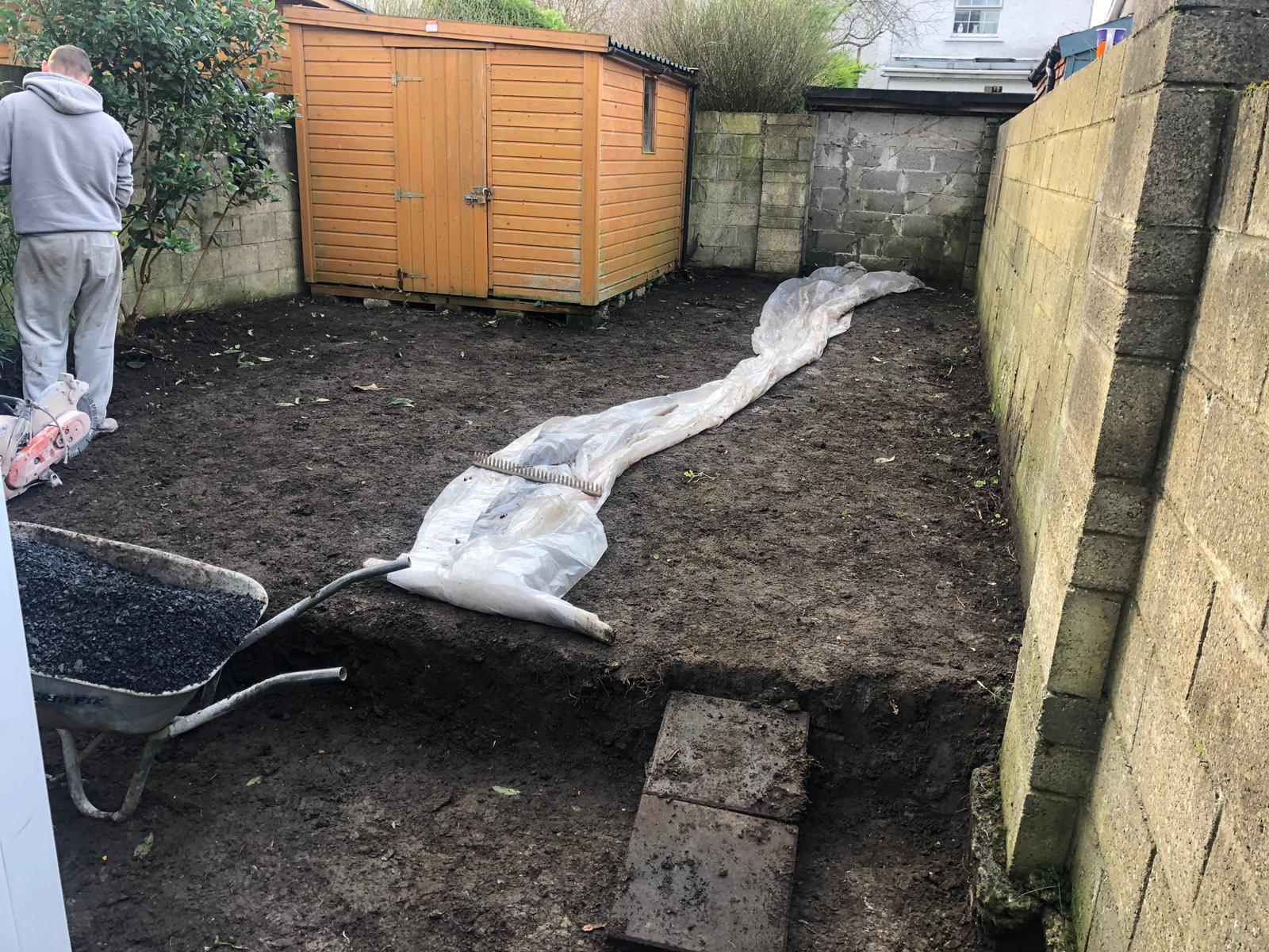 We have dug out a lawn and patio area down to a specified depth, while also removing the existing stepping stones. We have supplied and laid a protective membrane sheeting underneath.