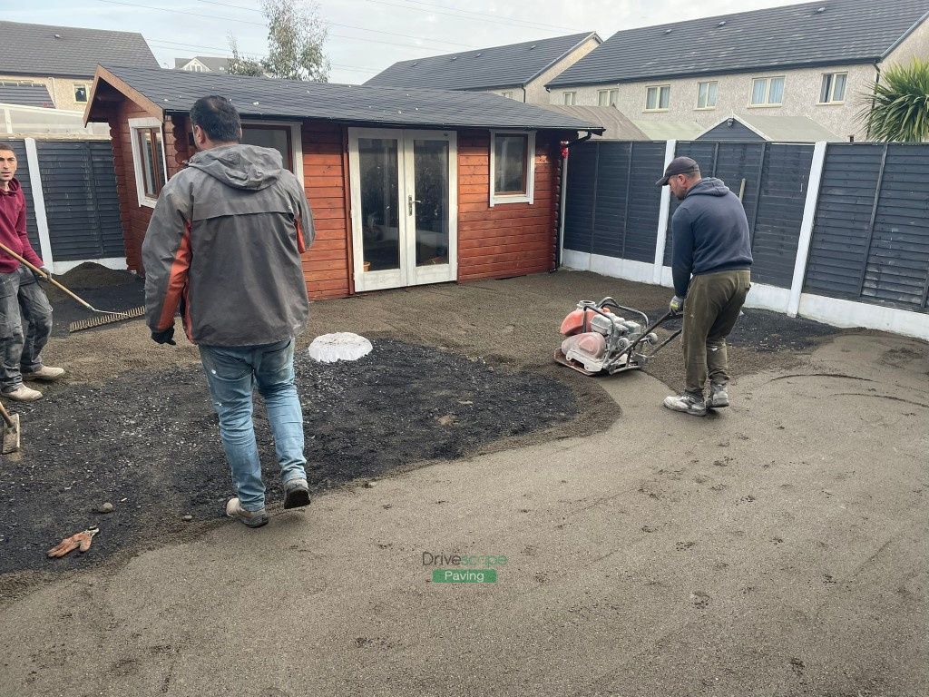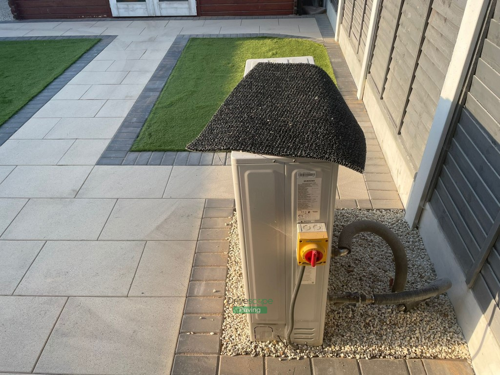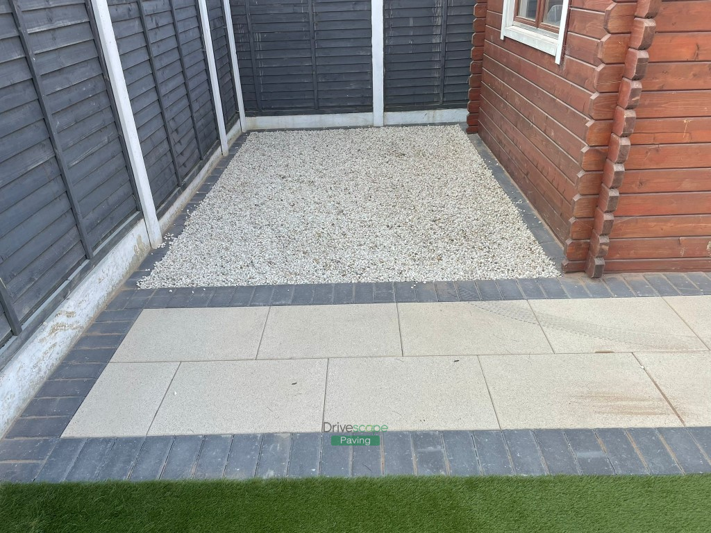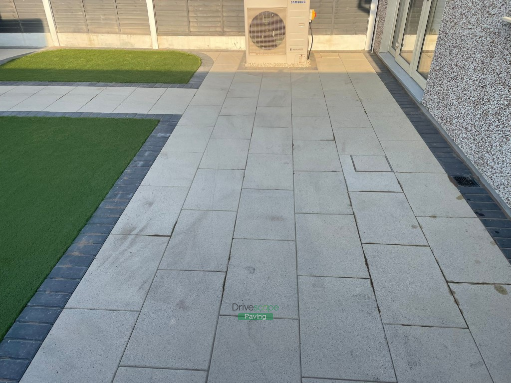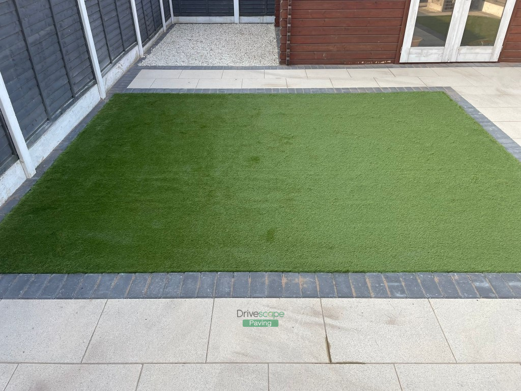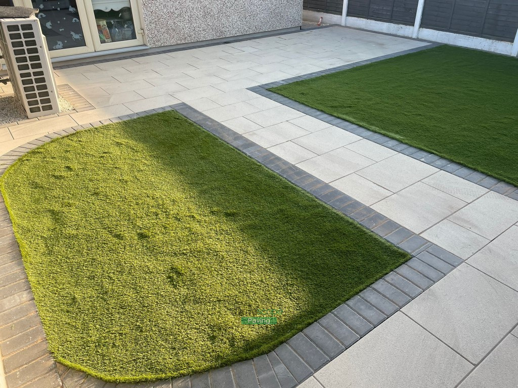 Newgrange Granite Buff Patio with Slane Borderline and Artificial Grass in Hansfield Wood, Dublin