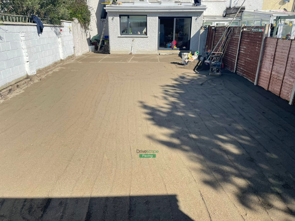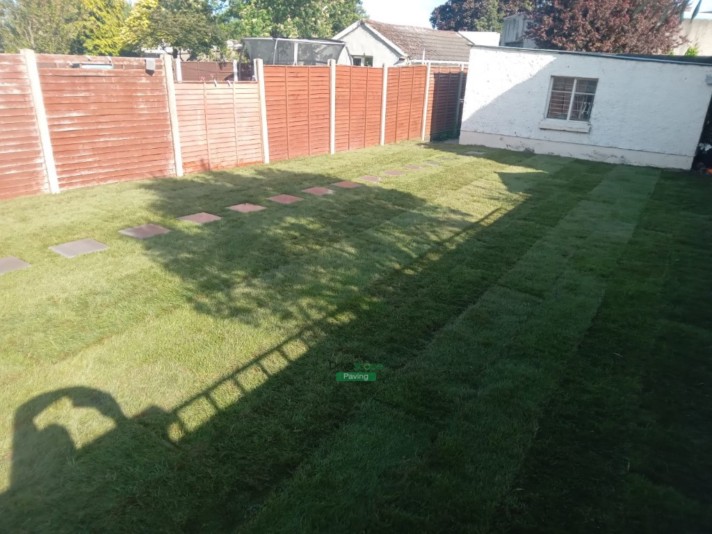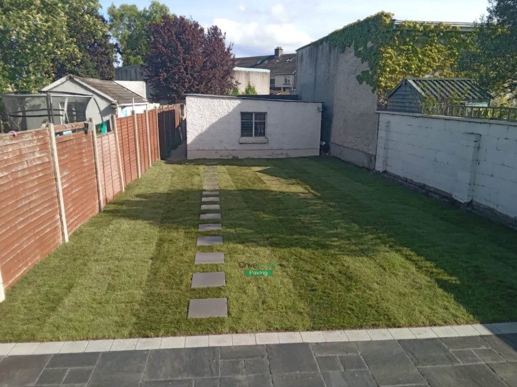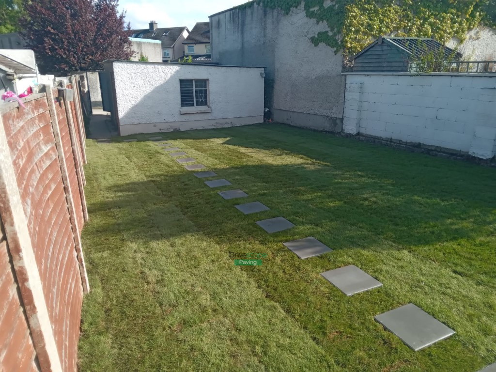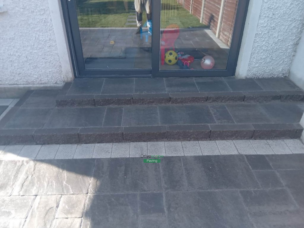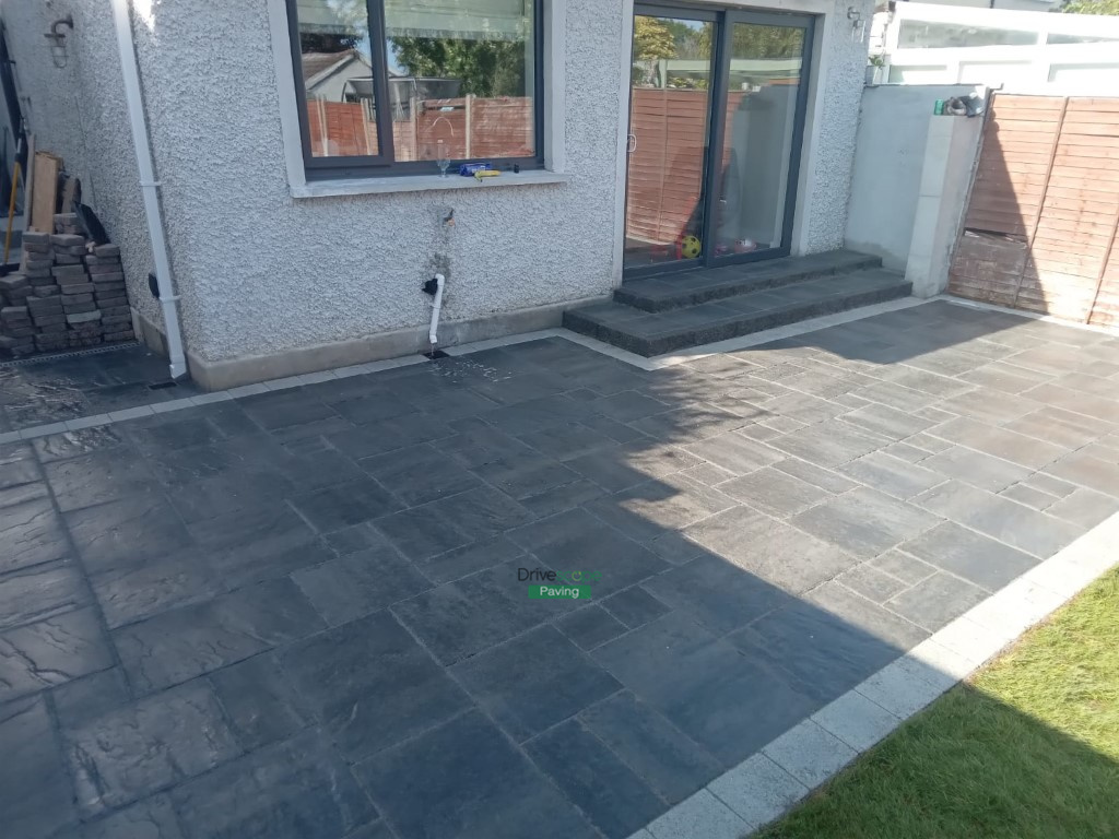 Drivescape Paving have installed a new patio in Palmerstown, Dublin. This patio features Belvedere slate slabs with silver granite borderlines, a double step and new roll-on turf.