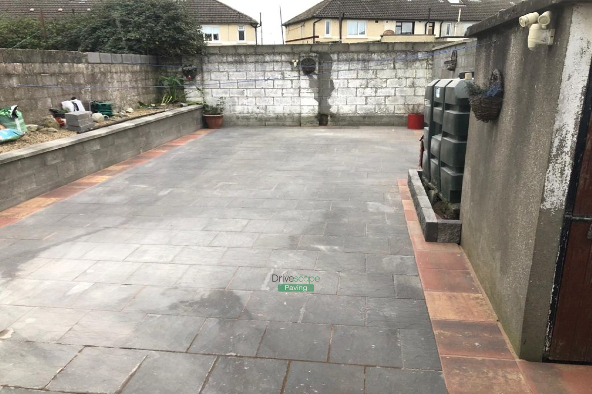 These photos showcase a beautiful patio transformation completed by Drivesccape Paving in Whitehall, Dublin. We laid the patio with 400 by 400 mm charcoal and rustic classic flagstones, put in new ACO channels and dropped the existing flowerbeds to the requested height.