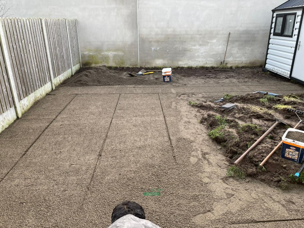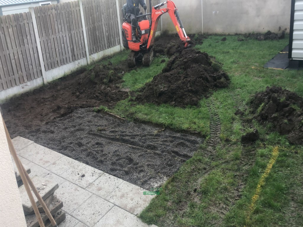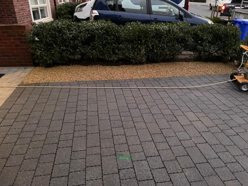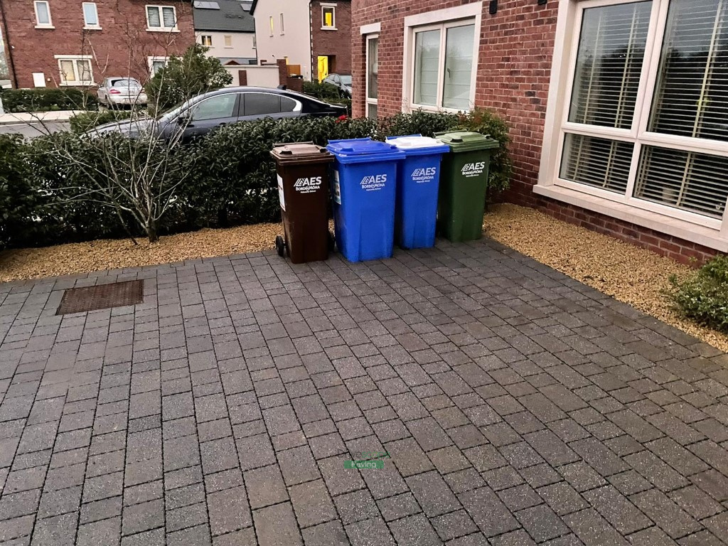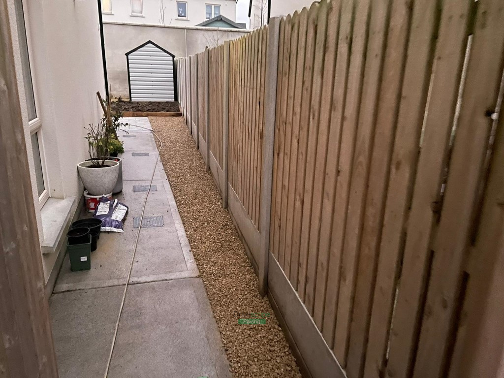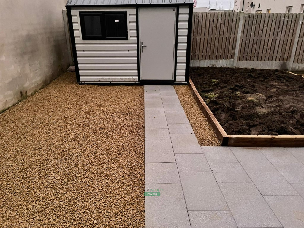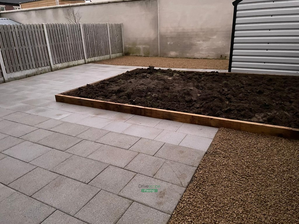 This patio project has been completed by Drivescape Paving in Naas, Co. Kildare. We laid the patio using 600 by 400 mm Newgrange granite slabs with railway sleepers as borders for flowerbeds. We installed Ballylusk golden gravel in several areas, that will omit any maintenance that you would otherwise have with a lawn. The whole area has been corrected to the right level and we implemented ACO channels to prevent water pooling on the surface. We also installed gravel strips around the customer’s existing driveway at the front of the property.