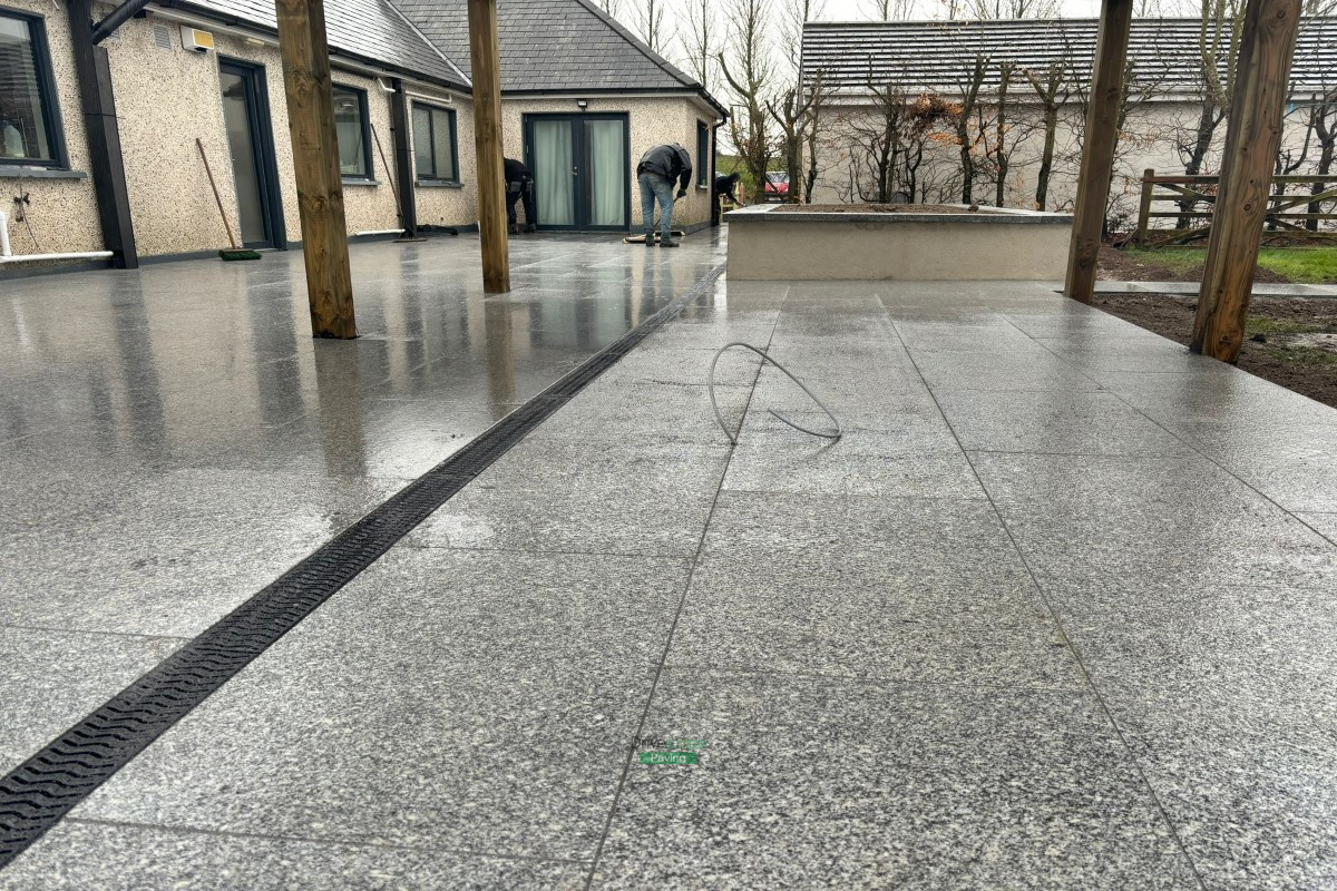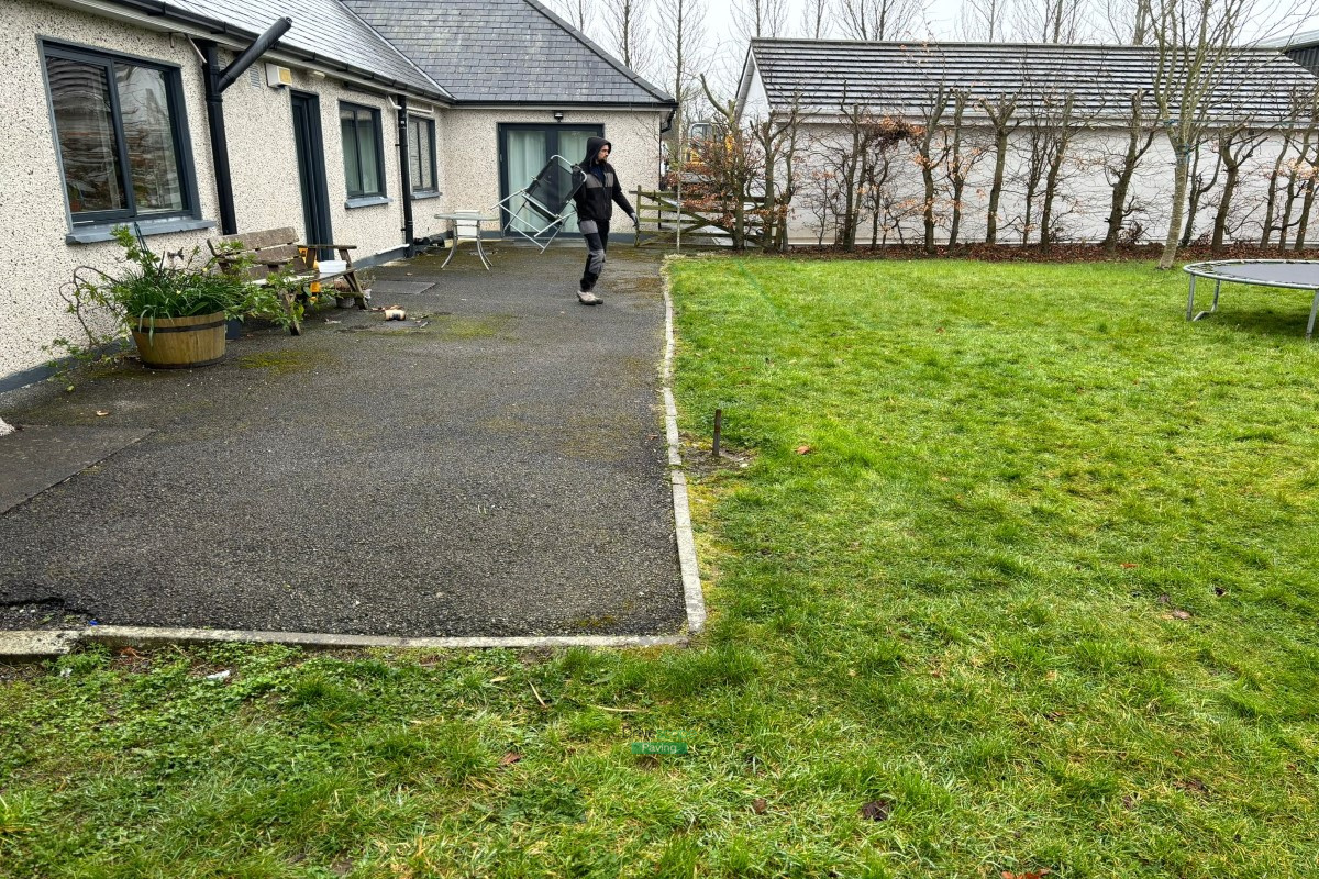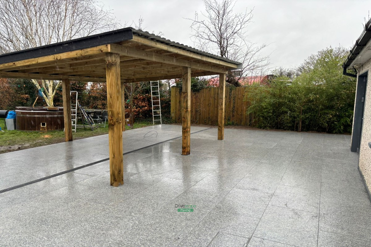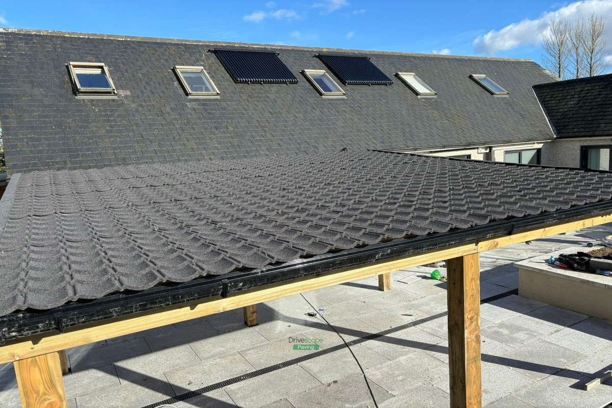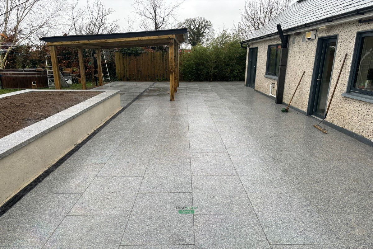 Patio with Gravelled Pathway, Roofed Pergola and Raised Flowerbeds in Balrothery, Co. Dublin