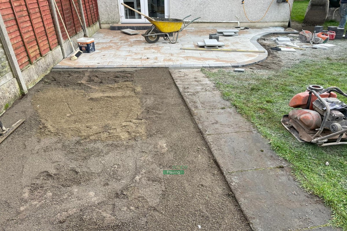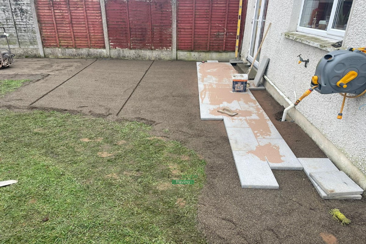 Patio with Newgrange Granite Slabs and Charcoal Border, New Steps and Roll-on Turf in Dublin