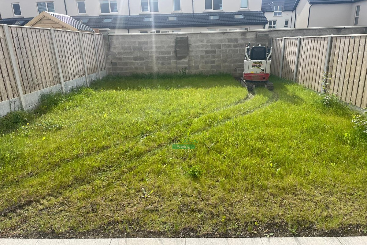 This patio in Portmarnock features 600 by 400 mm Newgrange granite slabs with Mellifont kerbing, stepping stones and roll-on turf.