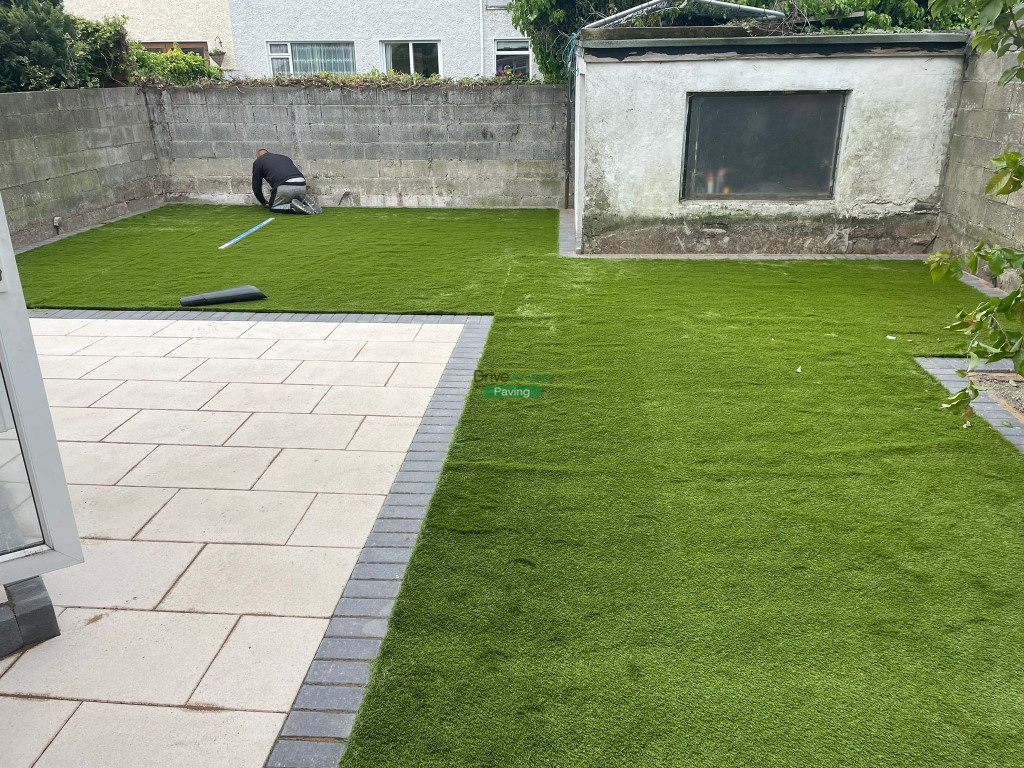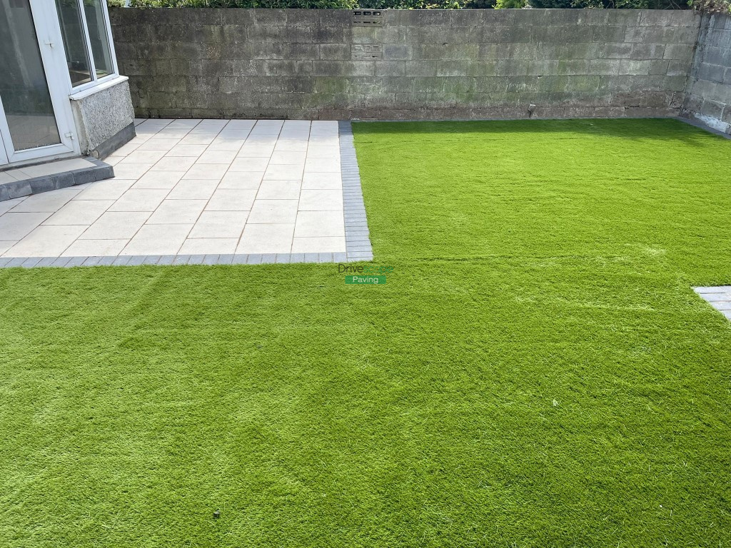 This is a new patio that Drivescape Paving installed in Blanchardstown, Dublin. This patio features quartz slabs with a charcoal block paved border and Phoenix artificial grass.