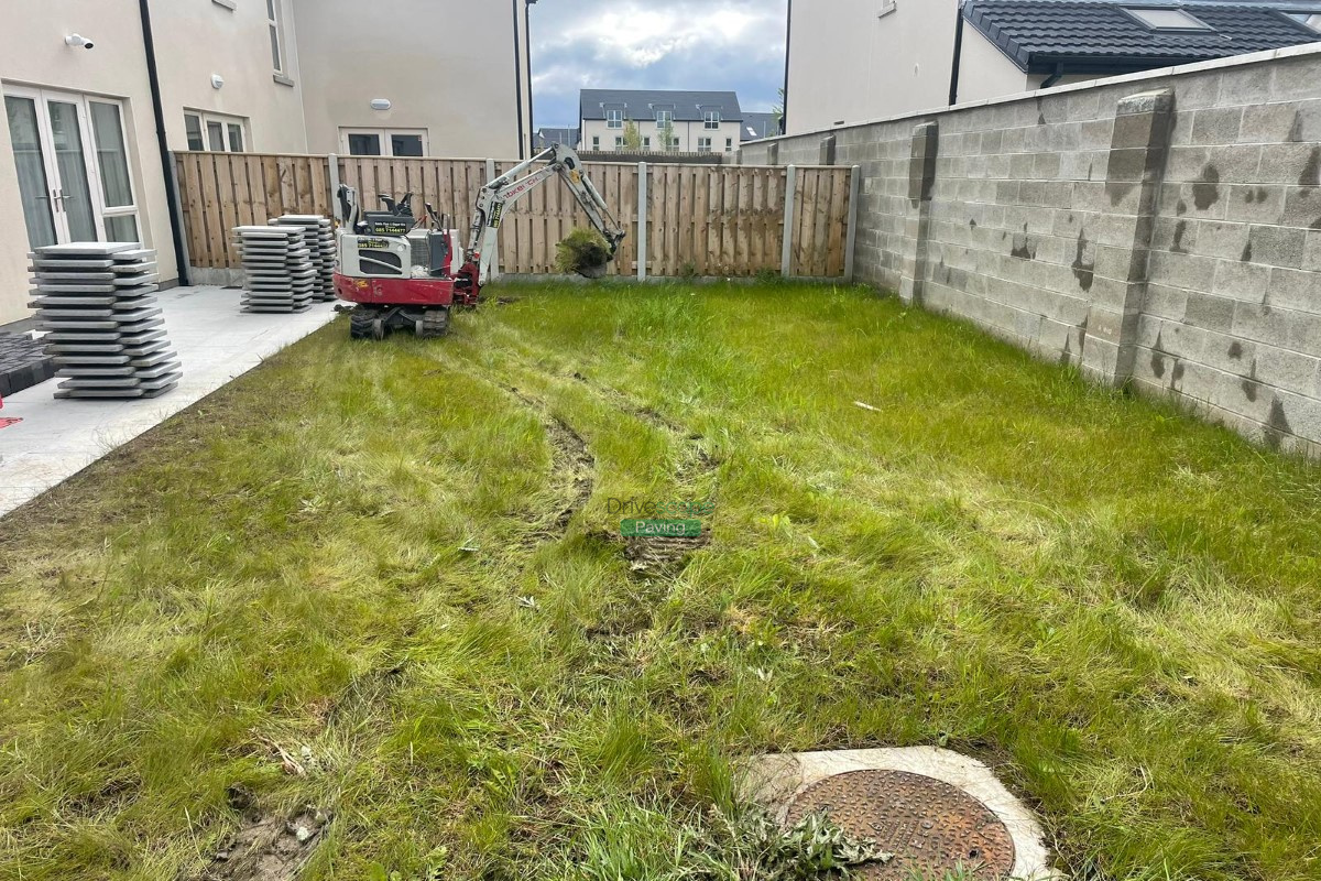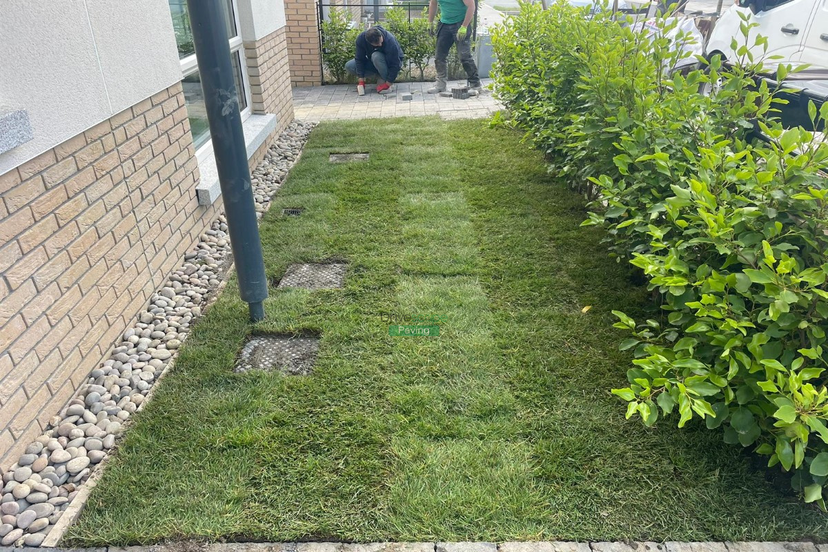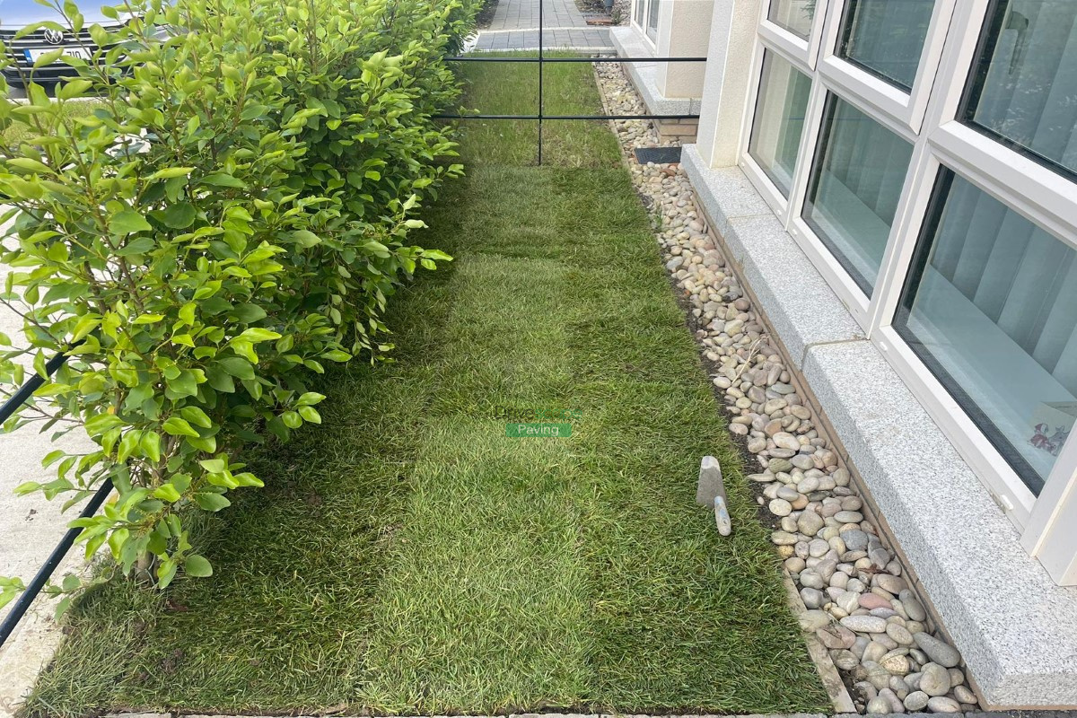 Drivescape Paving installed a new patio in Portmarnock, using 600 by 400 mm silver Newgrange granite slabs and roll-on turf.
