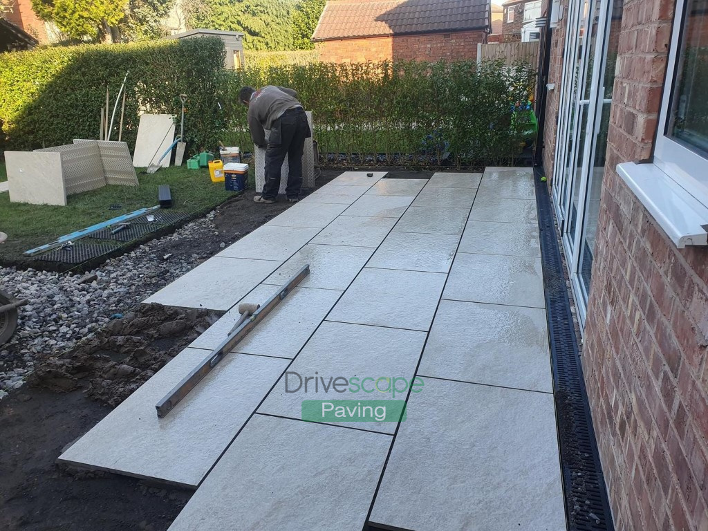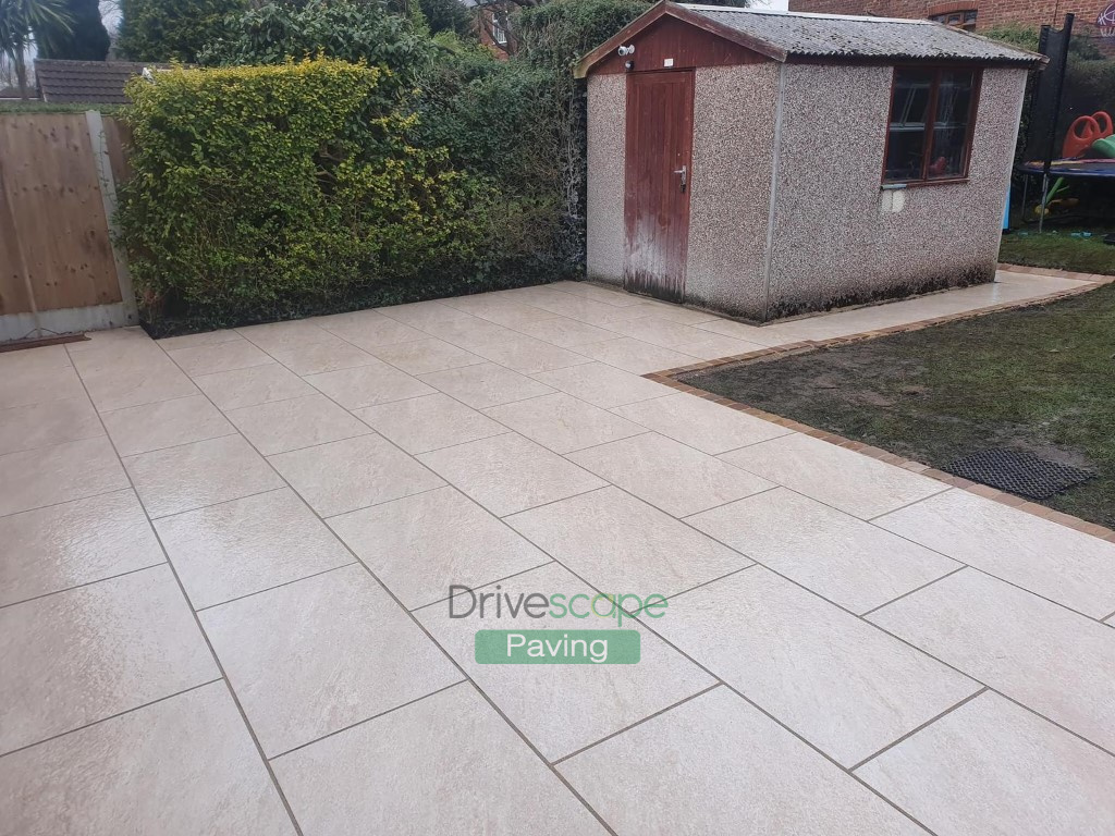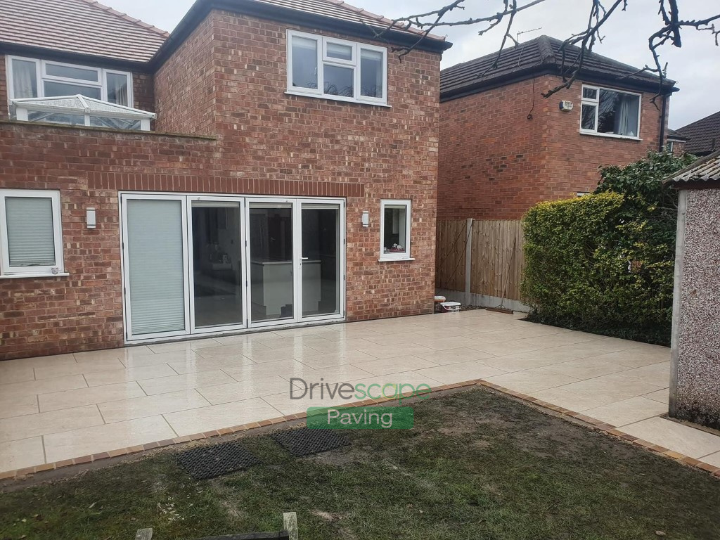 Our team at Drivescape Paving has installed this patio in Stillorgan, Co. Dublin using Beige Porcelain tiles with Tan Limestone borderline.