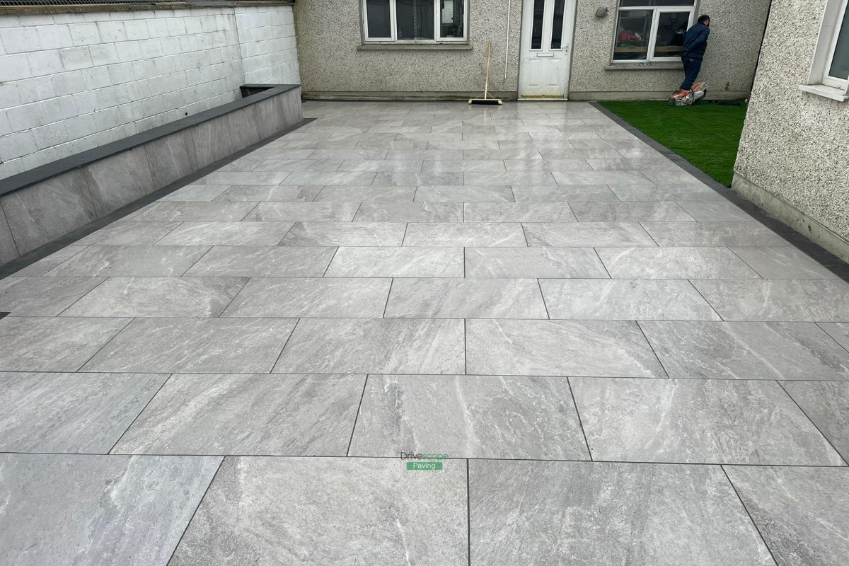 Drivescape Paving installed a beautiful new patio in Lucan Dublin. This transformation features 600 by 300 mm porcelain tiles in the colour ‘Stonehenge’, granite borderline and artificial grass. We installed a new drainage system with French drains and ACO channels. We also built new raised flowerbeds with matching porcelain tiles and capped them with black limestone.