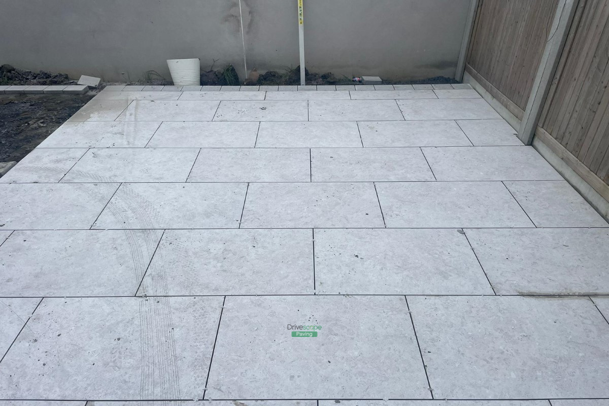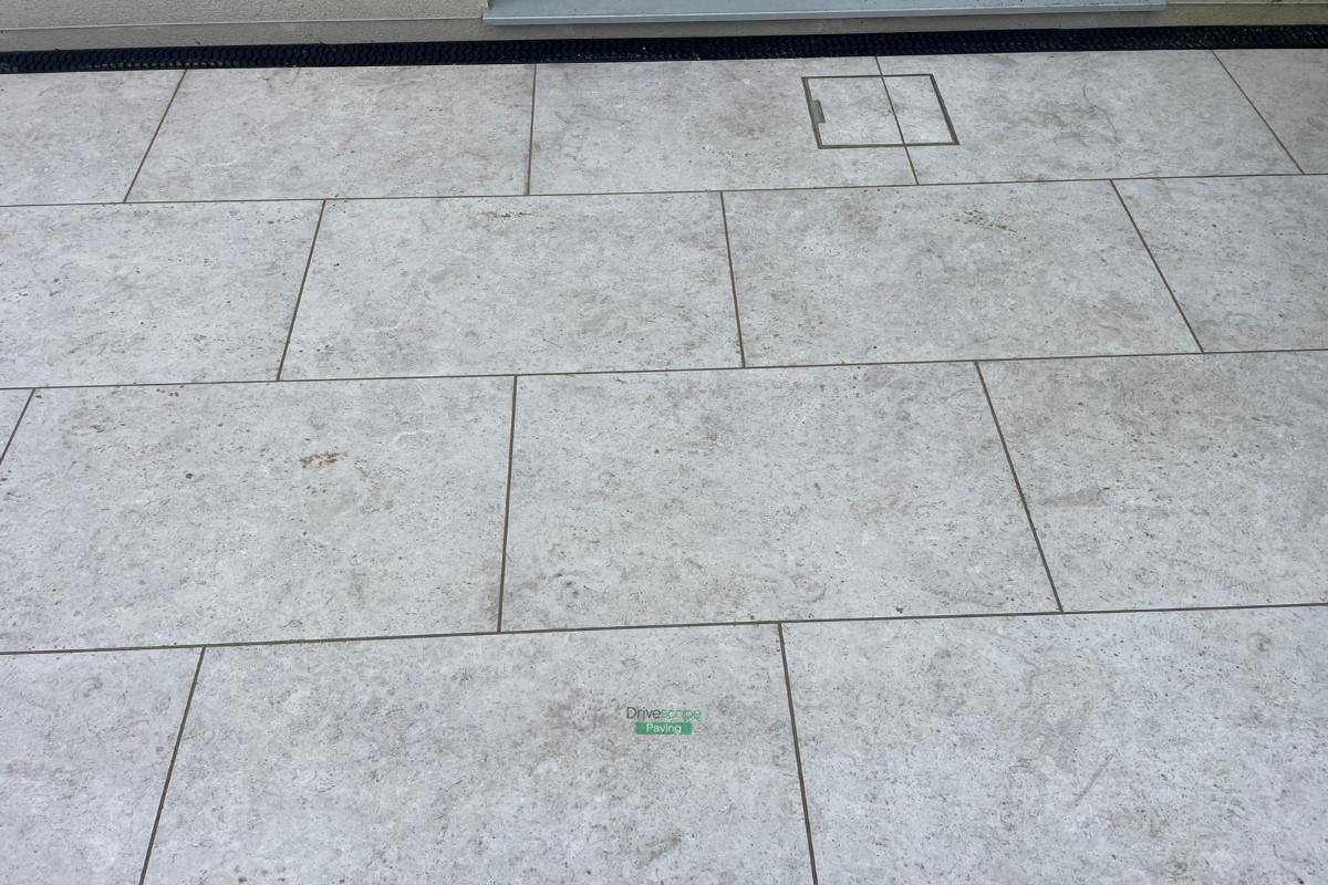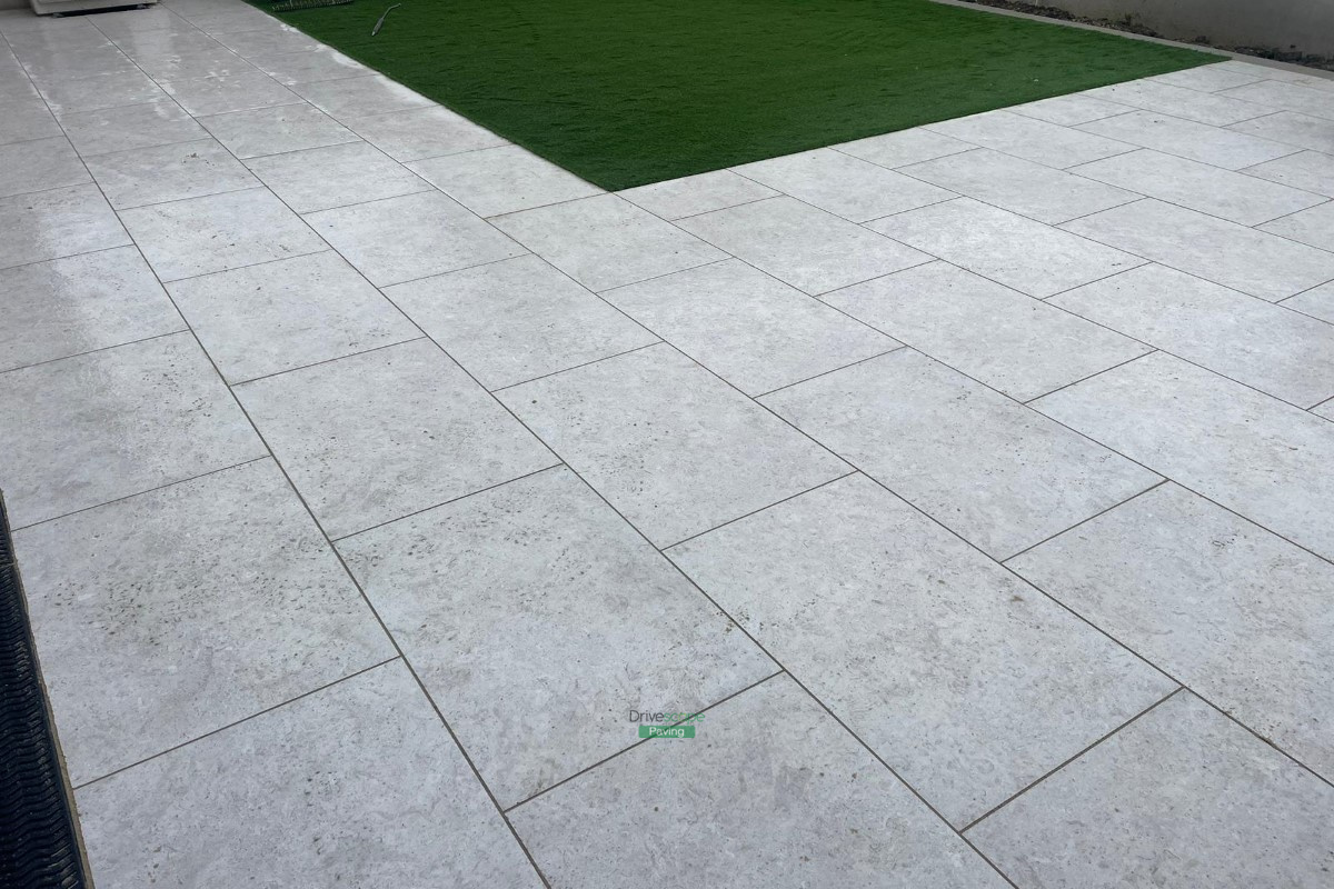We laid a new patio in Portmarnock, Co. Dublin, featuring 600 by 900 mm porcelain tiles, 14 mm artificial grass, silver granite borderlines, a recessed manhole cover and ACO drains.