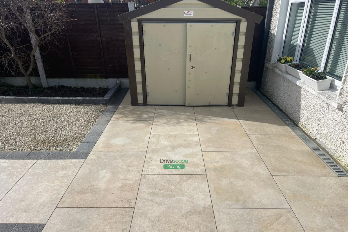 We completed this new patio in Celbridge, Co. Kildare, featuring 600 by 900 mm beige porcelain tiles with black granite borderlines, new kerbstones for flowerbeds and gravel on both sides of the pathway.
