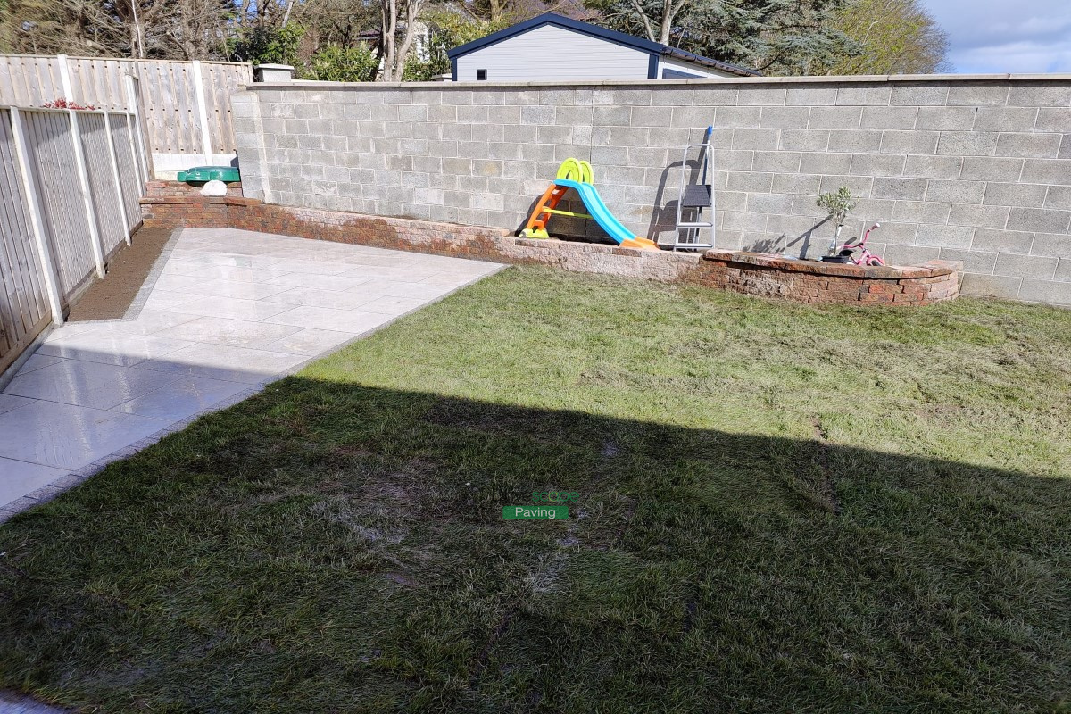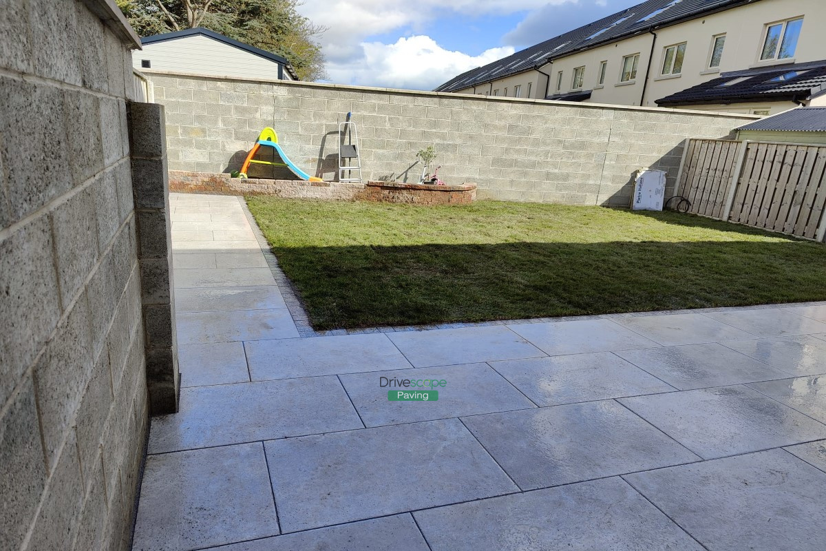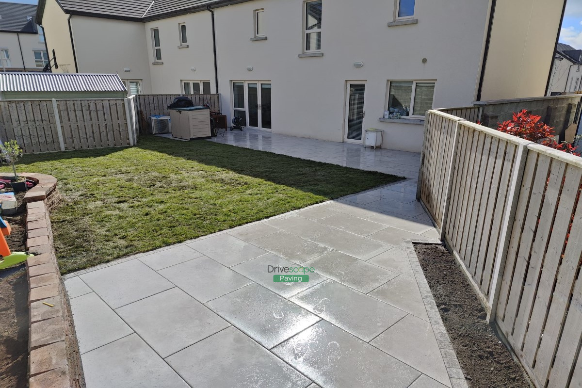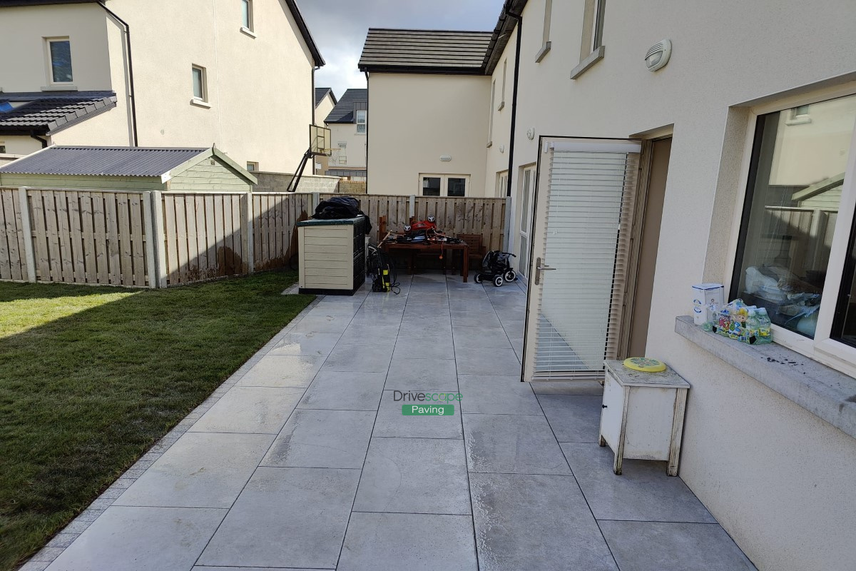 Porcelain Tiled Patio with Granite Cobblestones and Roll-On Turf in Portmarnock, Co. Dublin
