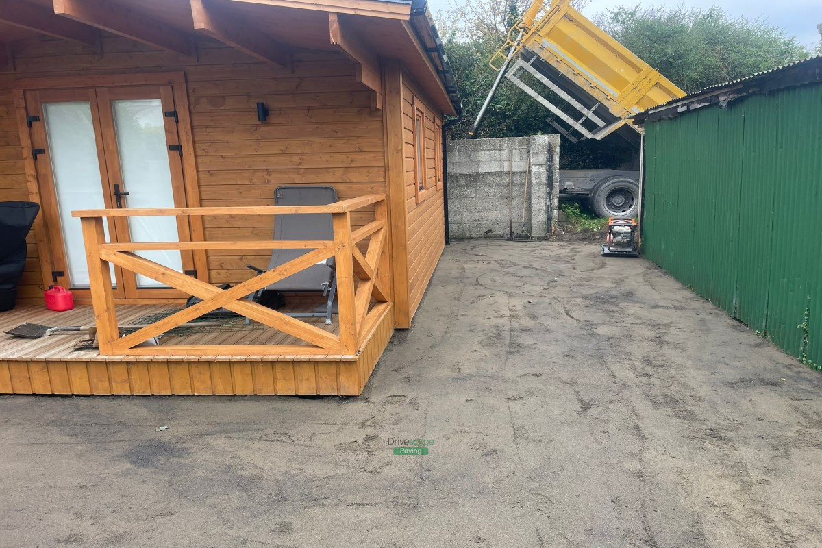 Here we have a new patio with 600 x 900 mm ‘Stonehenge grey’ porcelain tiles, ACO drainage channels, new fencing and a side entrance gate.