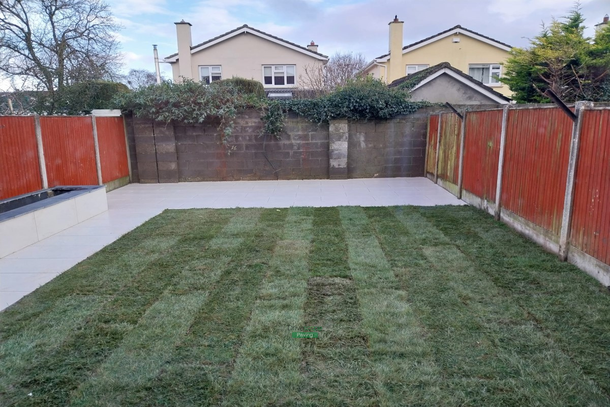 Drivescape Paving finished a new patio in Celbridge, Co. Kildare. It features alpine porcelain tiles, a new lawn with a drainage system and raised flowerbeds with capping for seating.