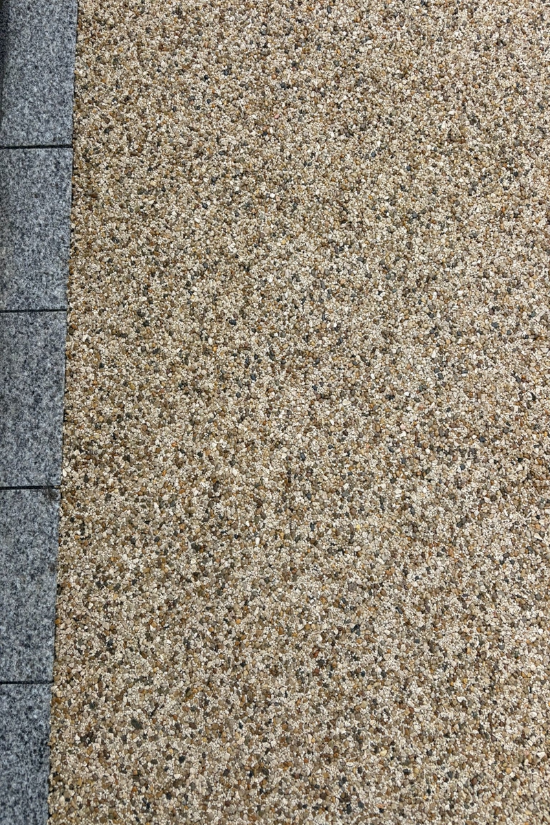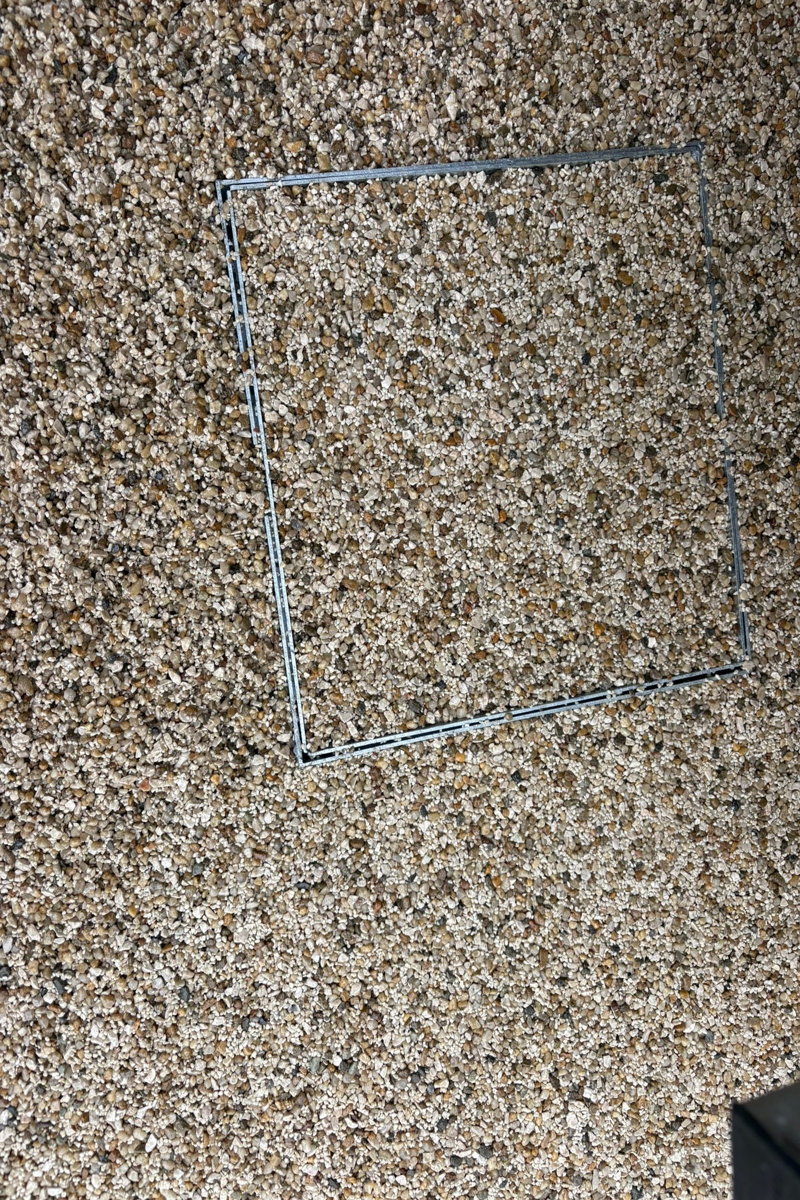 Resin patio installation completed in Rathdrum, Co. Wicklow. Features 200 x 100 silver granite cobble borderline, new granite step at patio door, concrete base prepared for extending existing shed, gravel pathway laid around shed, and recessed covers installed.