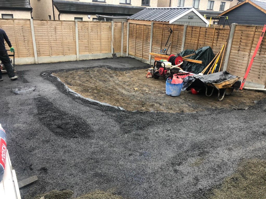 First we cleared out the original back garden and laid foundation for its new design. We installed new base for a shed and raised flower-beds with New Grange Corrib blocks.