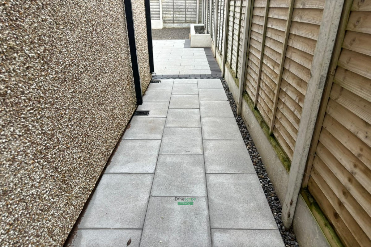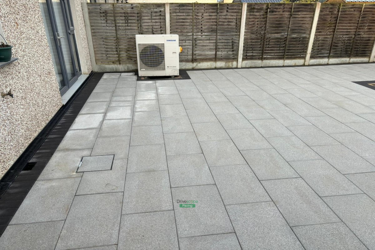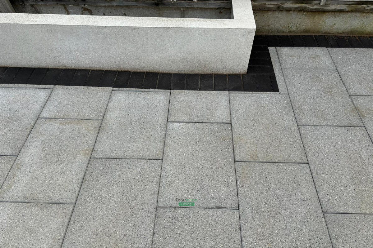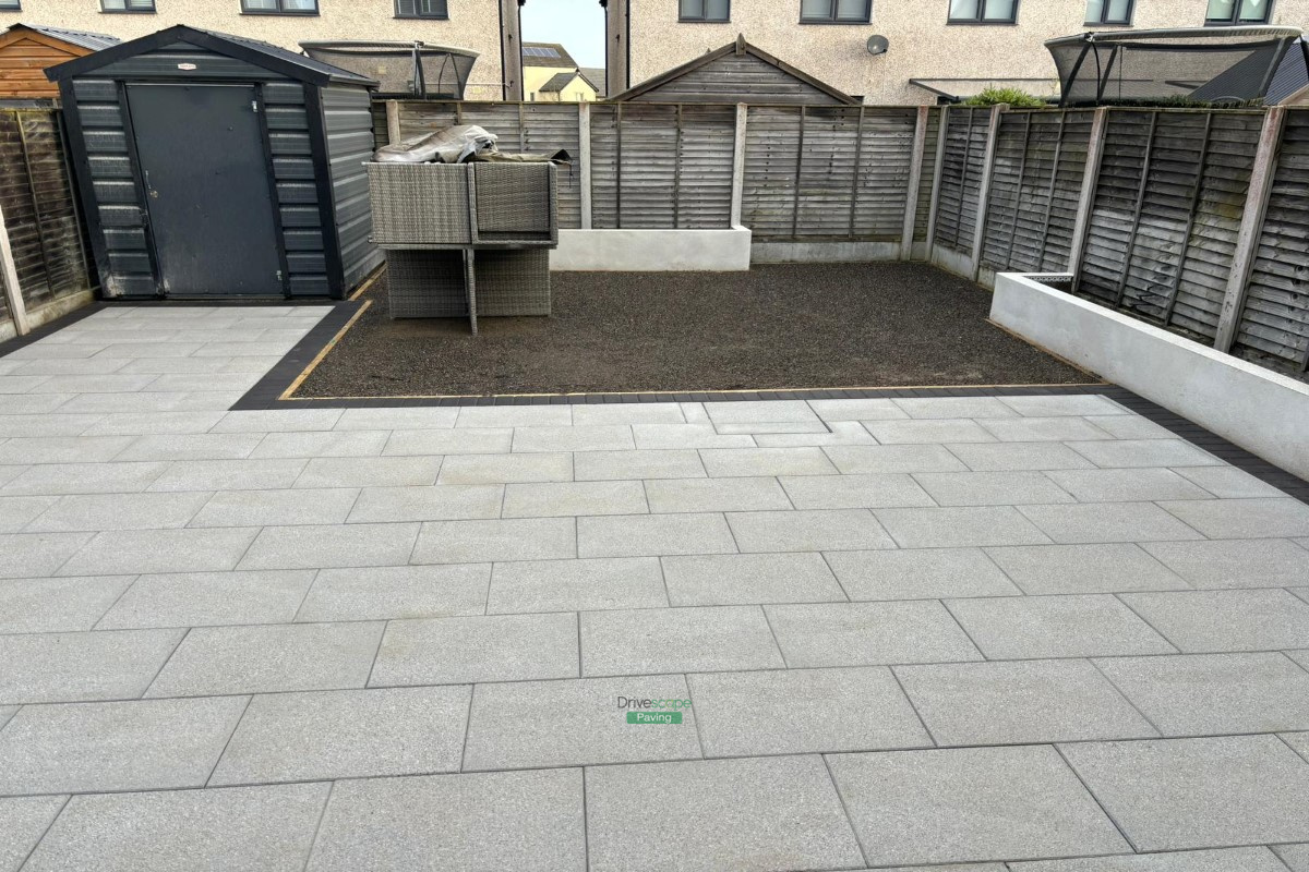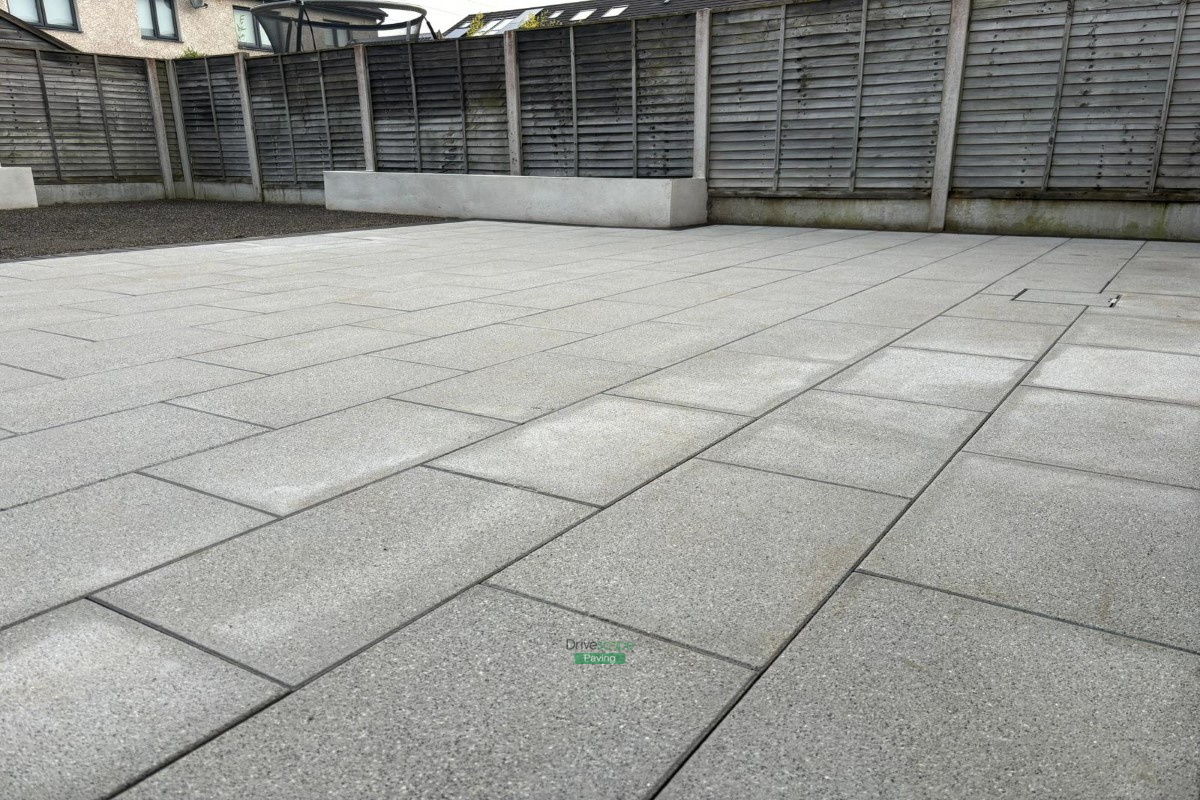 This patio in Hansfield Wood, Dublin, features 600 by 400 mm silver Newgrange granite paving slabs, 200 by 100 mm charcoal Slane brick borderline, raised flowerbeds with white cement plastering, ACO channels and recessed manhole covers. We also installed a new pathway along the house with French gravel drains and artificial grass in the back.