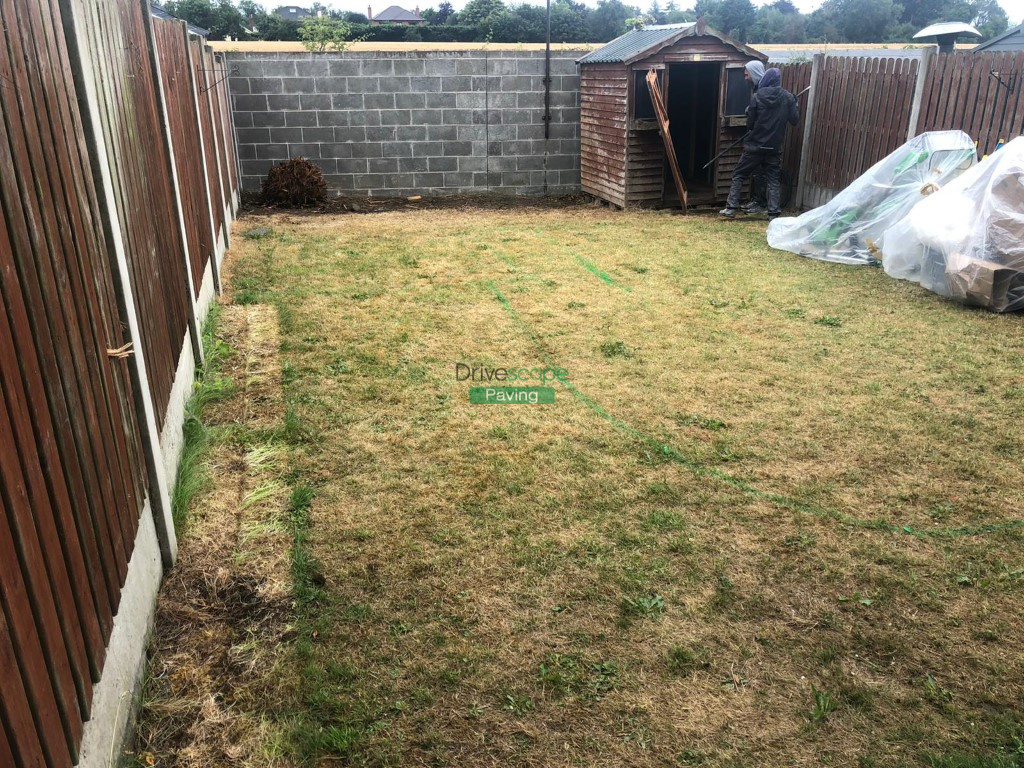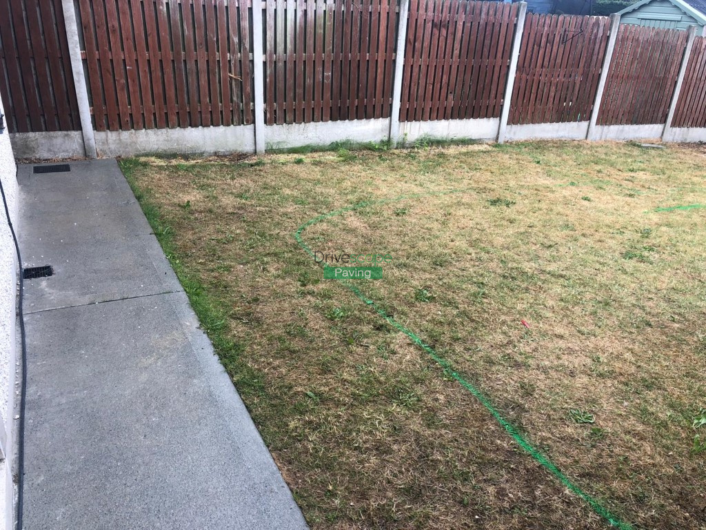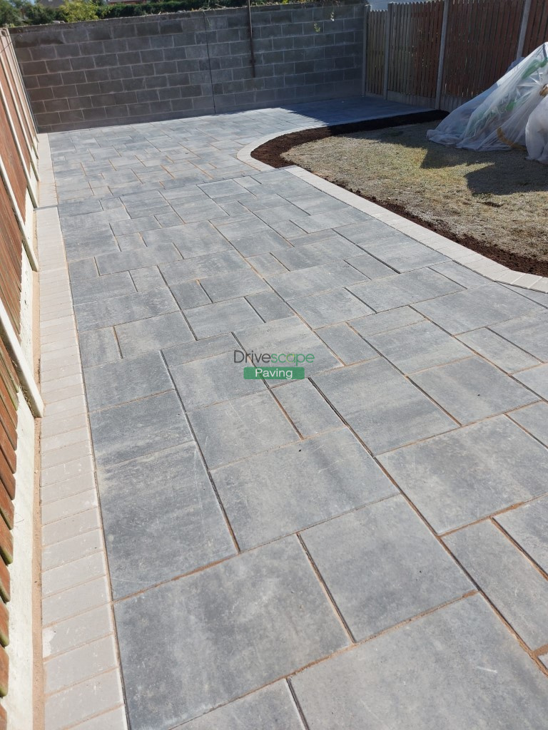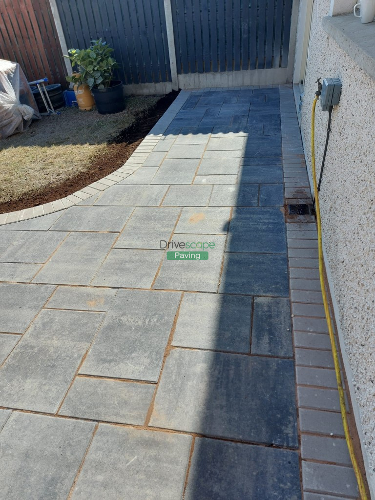 New patio has been completed by Drivescape Paving in Drogheda, Co. Louth, featuring a three size mix of silver grey blocks with 200 by 100 mm natural grey borderline. We have split the patio into two tiers with a half-moon lawn design.