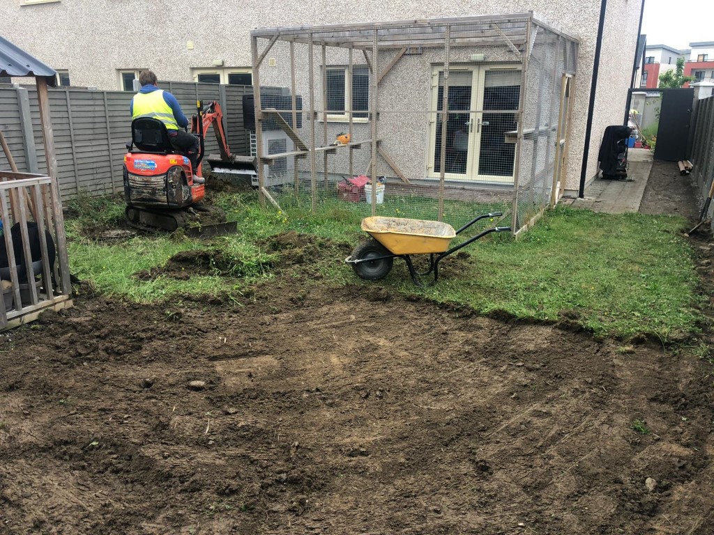 First we dug out the existing lawn and old patio. We laid down a new hardcore foundation and compacted it down. We installed the patio with 400 by 400 Black granite slabs with a Natural Grey borderline for contrast.
