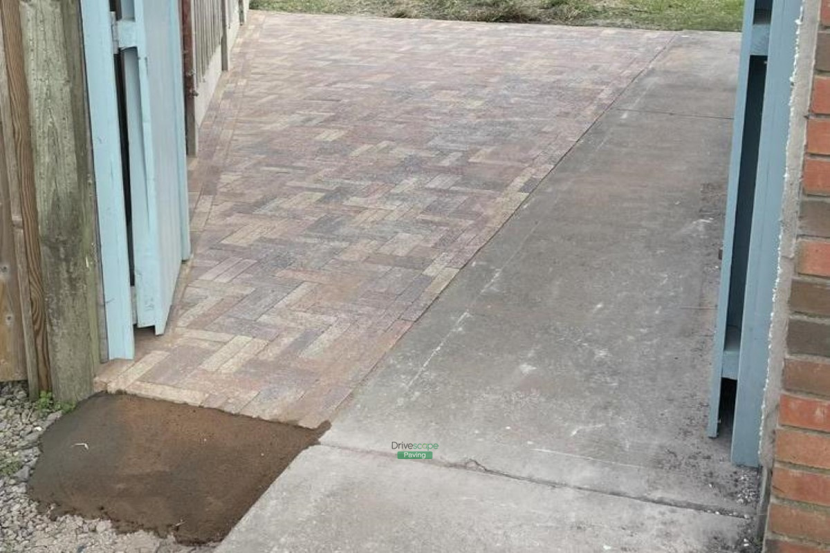 The patio features Inish rustic paving blocks set in a 90° pattern.