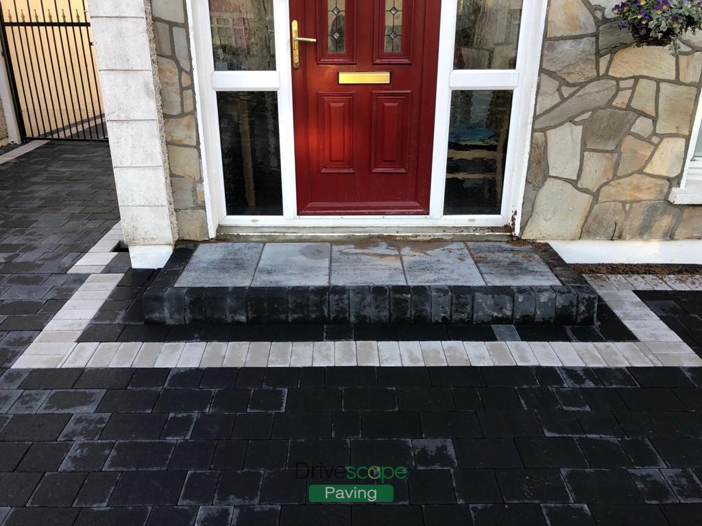 Our team at Drivescape Paving has completed this driveway using Charcoal Tegula paving blocks in three sizes with a Silver borderline. We also installed new kerbstones and a doorstep to match.