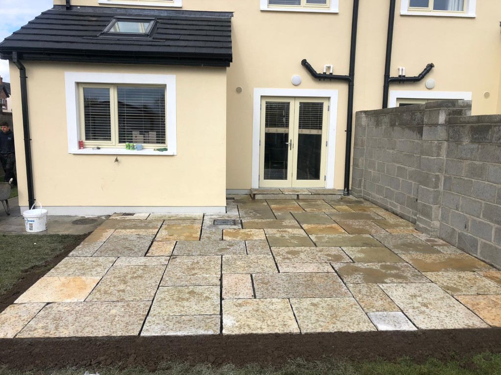 Afterwards we laid the patio with Yellow Limestone Slabs in various sizes and grouted them for a nice clean finish. We also fashioned a new doorstep to match the look of the patio.