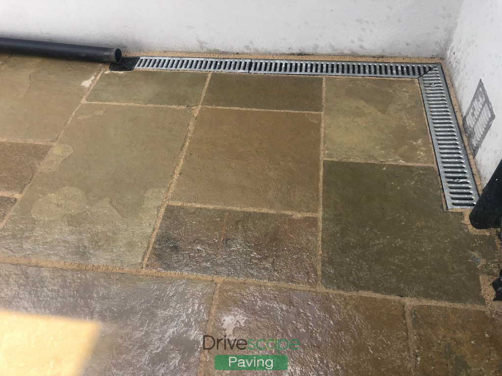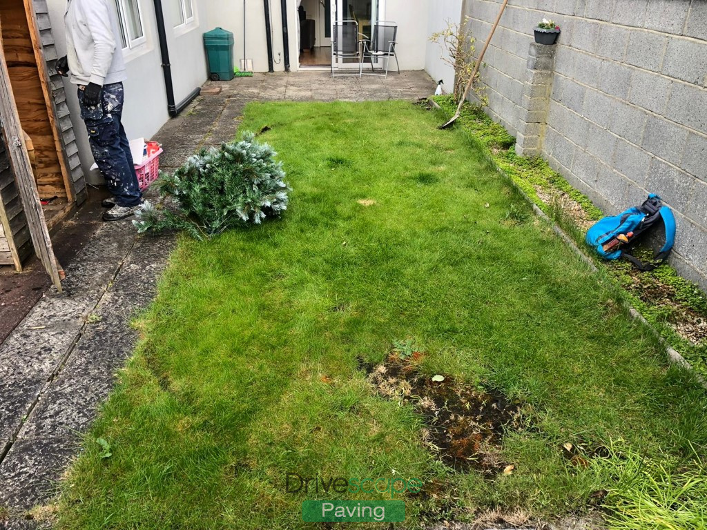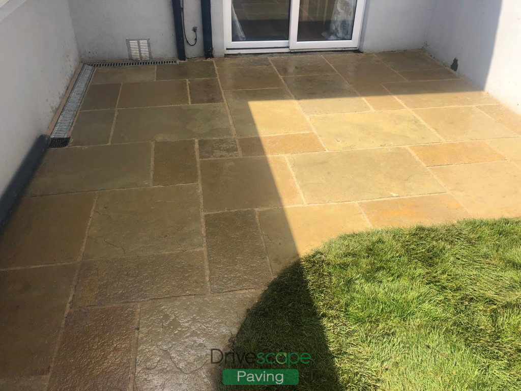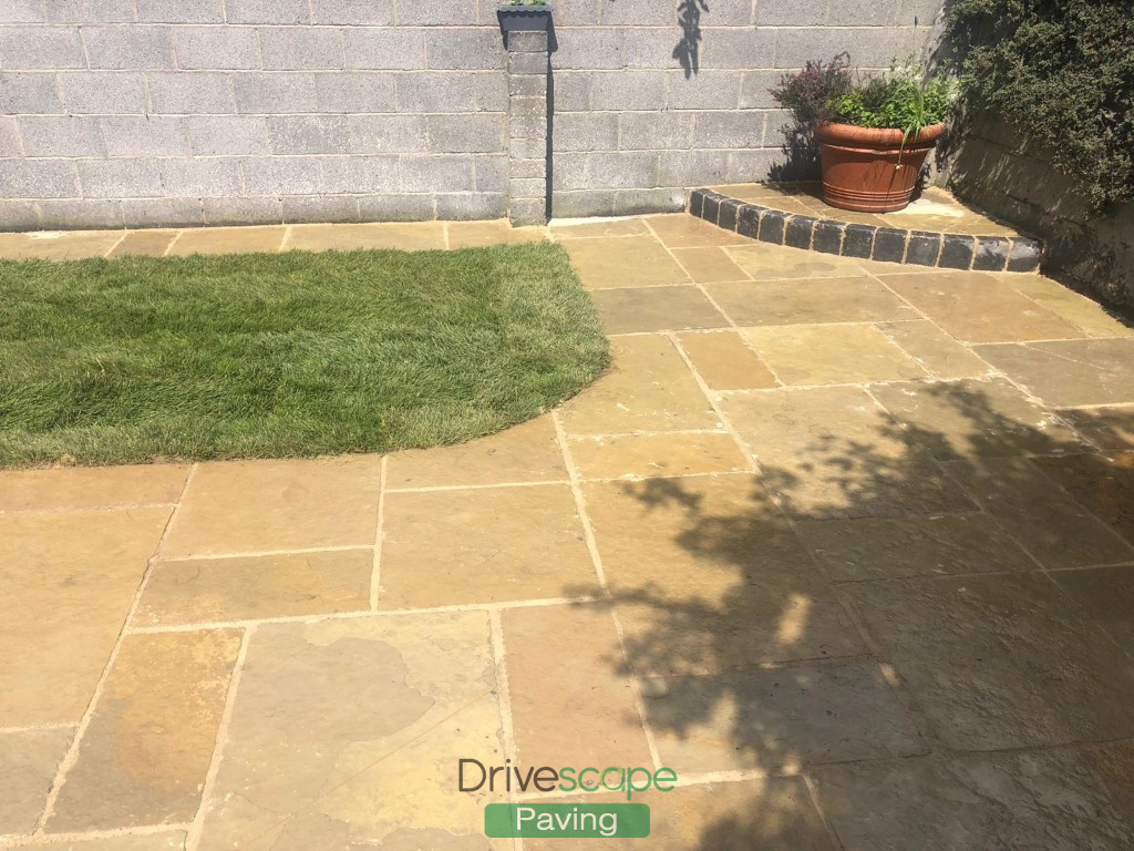 This new patio has been built by Drivescape Paving in Dublin 8. The patio features roll-on turf, raised planter area, ACO drain channels and Yellow limestone slabs for the top finish.